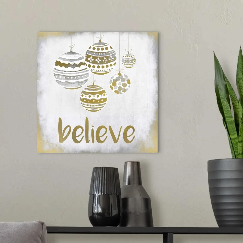 Gold and silver holiday ornaments hanging over the word "Believe."