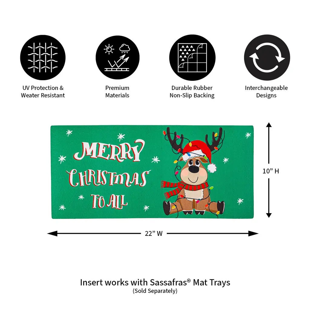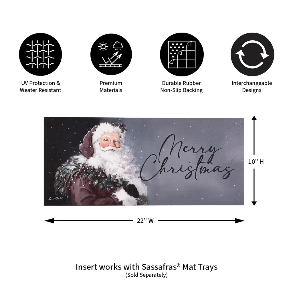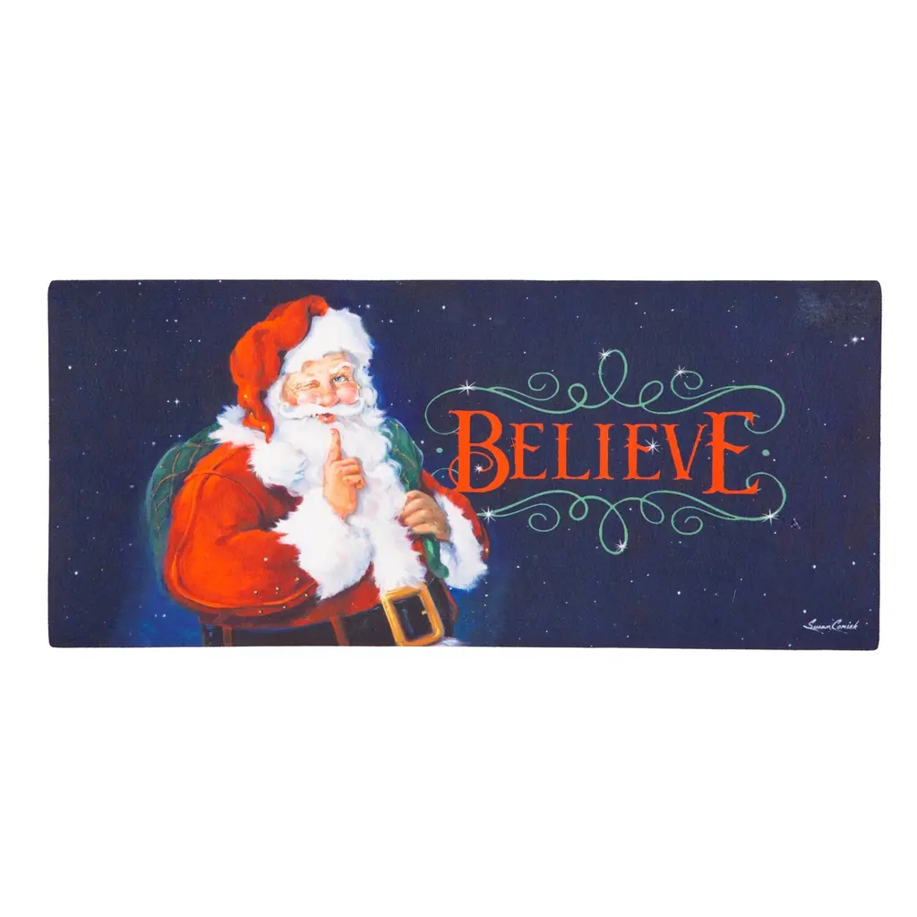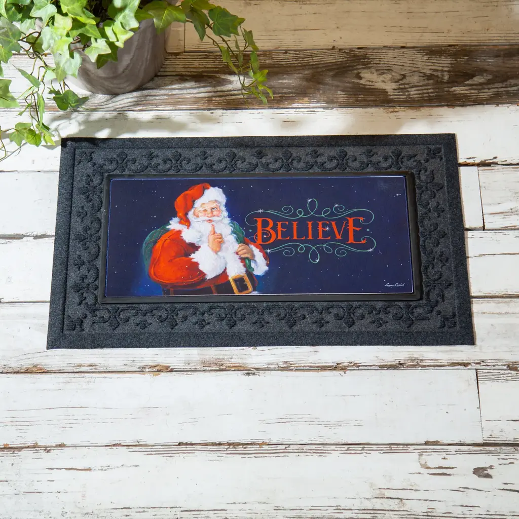 Welcome everyone from the family to Santa Claus himself home with this Sassafras switch mat. It features Santa himself with his sack of presents thrown over his shoulder and mischievous expression. The word Believe greets friends and family as they step through the door. Crafted from heat-sublimated polyester with a rubber backing, this versatile mat is designed to fit perfectly within Evergreen's switch doormat bases. The mildew resistant mat is ideal for indoor or outdoor use and features a skid-resistant backing to help keep it in place. This welcoming mat will freshen up your stoop season after season while ensuring your home stays debris-free. For stains, simply spot clean with soap and warm water.