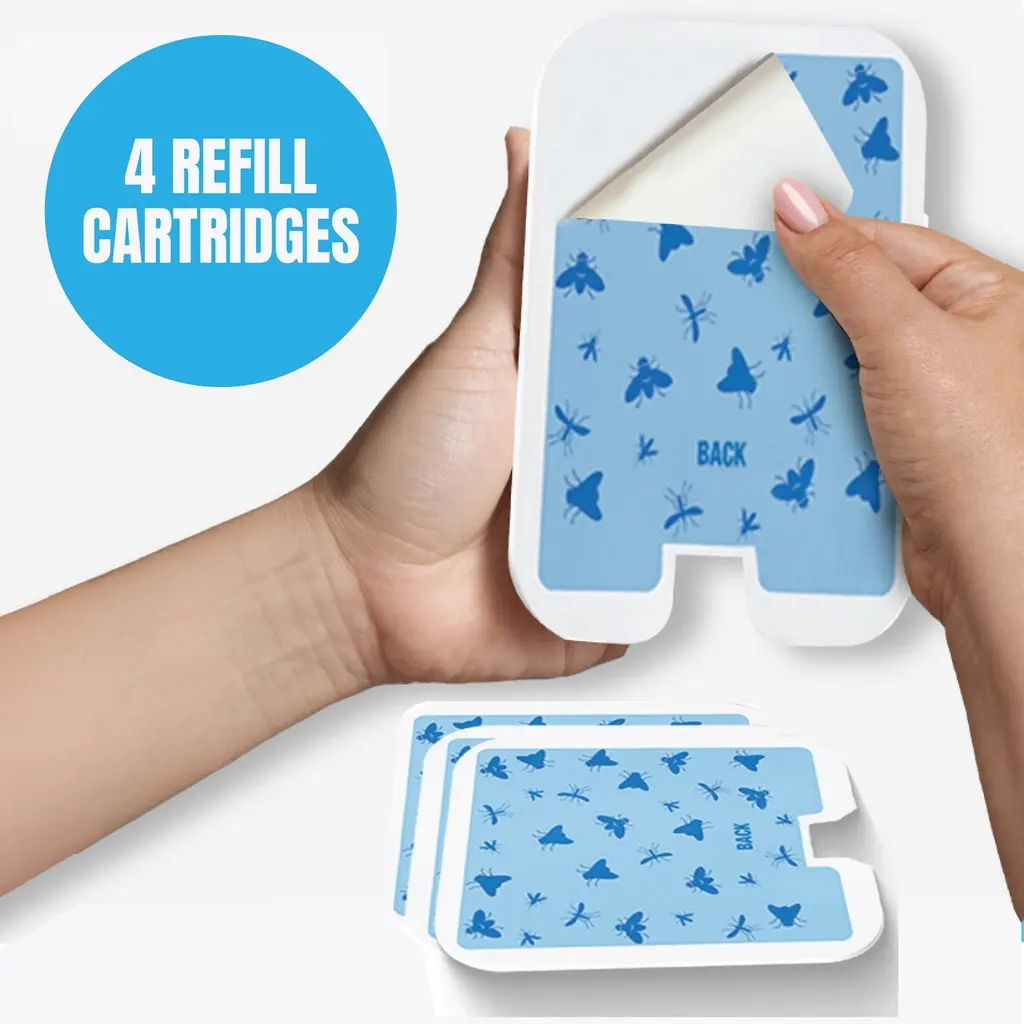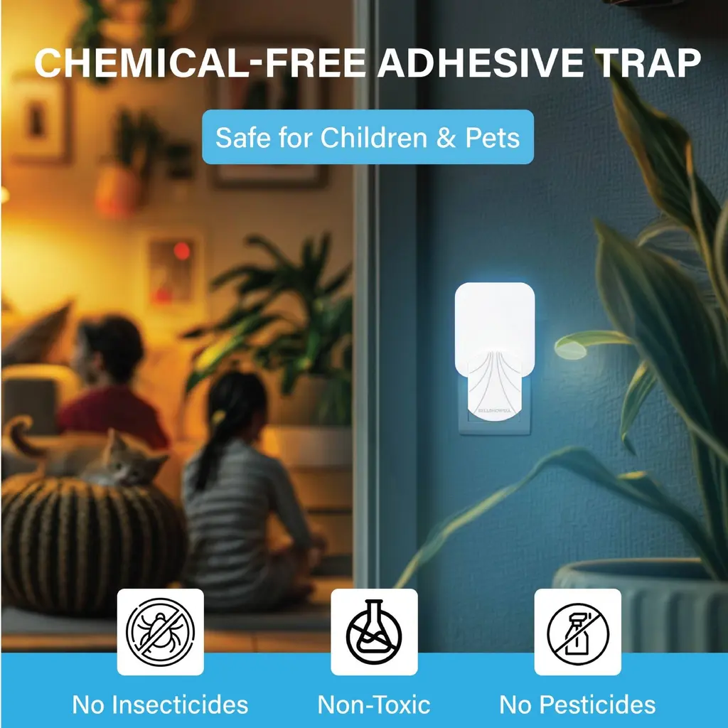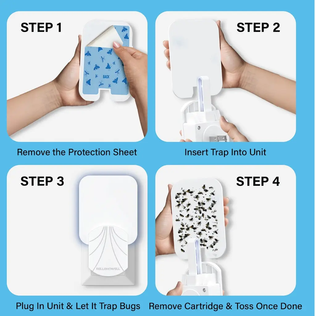 Introducing the Bell + Howell 4-Pack Indoor Plug-In Insect Trap Refills - Chemical-Free UV Adhesive Bug Capture Cartridges, a premium indoor pest control solution that combines advanced UV technology with a non-toxic adhesive trap. Designed to attract and capture common pests such as flies, gnats, moths, mosquitoes, and fruit flies, these refill cartridges are ideal for kitchens and living areas where style and durability matter. The hidden adhesive trap, facing the wall, discreetly secures captured insects for a cleaner, more inviting environment. Enjoy safe, chemical-free protection that's perfect for households with children and pets. Key Features: UV Light Attraction: Equipped with energy-efficient UV technology, these cartridges lure in a variety of insects for targeted indoor pest control. Chemical-Free Adhesive: The non-toxic, pesticide-free adhesive ensures safe use around children and pets while eliminating common household pests. 4-Pack Durability: Each refill cartridge is engineered for consistent performance and long-lasting effectiveness, providing reliable insect capture over time. Discreet Design: With the sticky adhesive mounted to face the wall, captured bugs remain hidden from view, maintaining the aesthetic appeal of your space. Eco-Friendly and Safe: Crafted without harmful chemicals, this insect trap refill supports a healthy, eco-conscious environment for your home.