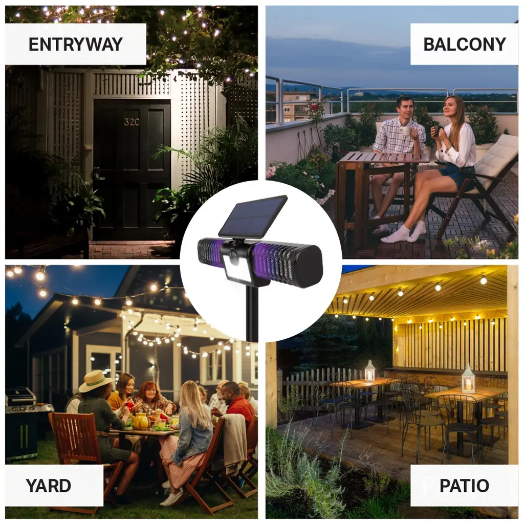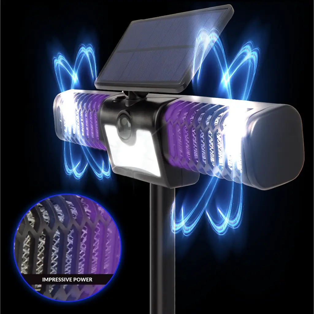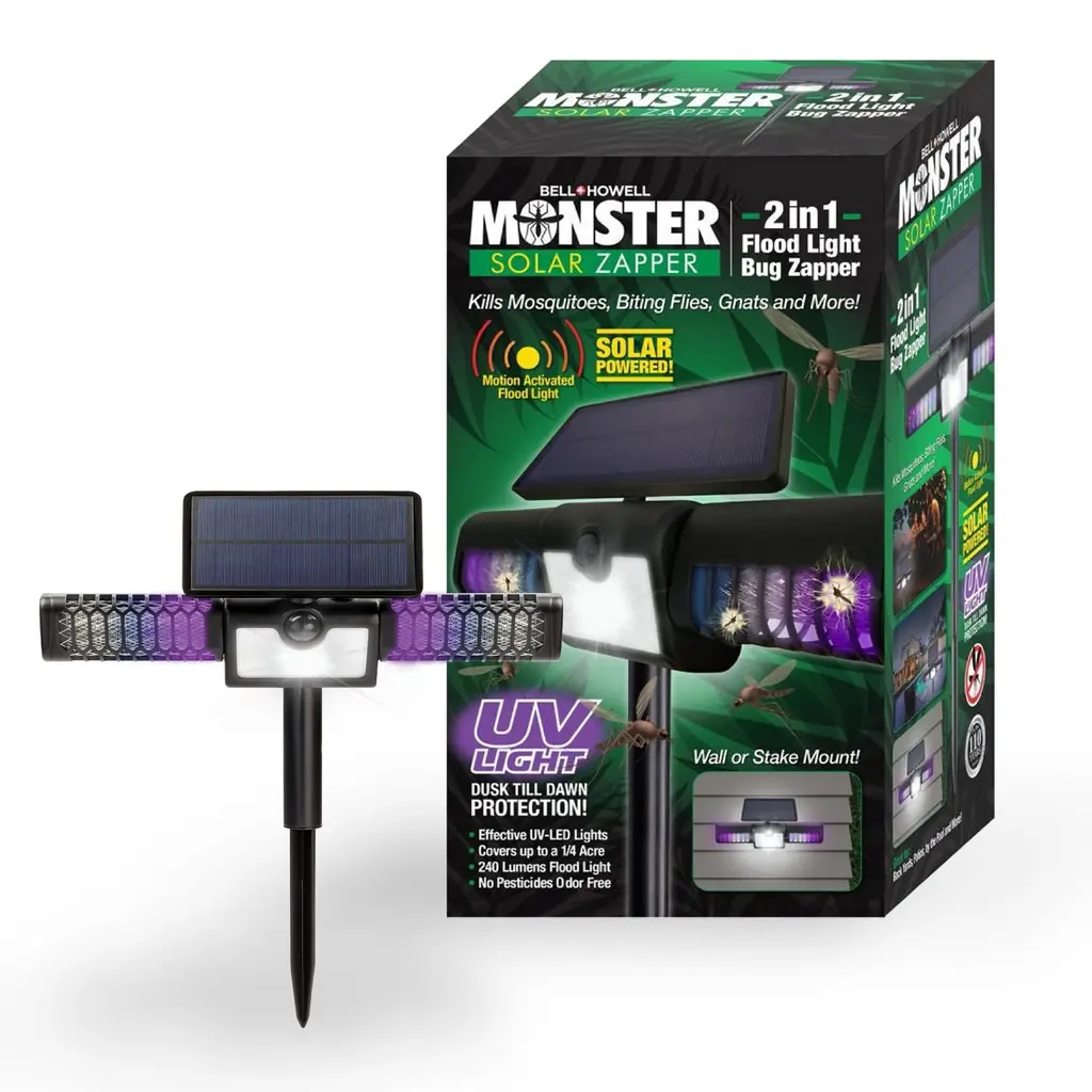 The Bell + Howell Rogue Monster Solar Zapper combines a solar-powered bug zapper with a motion-activated floodlight, offering 240 lumens of brightness and UV light for effective insect control. Its dusk-to-dawn protection ensures continuous operation, while the pesticide-free design makes it safe and odor-free. Ideal for backyards, patios, and pool decks, this versatile device can be wall-mounted or staked into the ground, with adjustable zapper arms for targeted coverage. Key Features: 2-in-1 Solar-Powered Bug Zapper and Floodlight: Combines a high-intensity UV light to attract and eliminate mosquitoes, gnats, and flies with a 240-lumen motion-activated floodlight for enhanced outdoor illumination. Eco-Friendly and Odor-Free: Operates without pesticides, providing a safe and environmentally friendly solution to insect control without unpleasant odors. Versatile Mounting Options: Designed for easy installation, it can be mounted on walls or staked into the ground, making it perfect for backyards, patios, and pool decks. Adjustable Zapper Arms: Features rotating zapper arms that allow you to direct coverage precisely where needed, ensuring optimal insect control in your desired areas. Dusk-to-Dawn Protection: Equipped with a solar-powered system that provides continuous operation from dusk till dawn, keeping your outdoor spaces protected throughout the night.