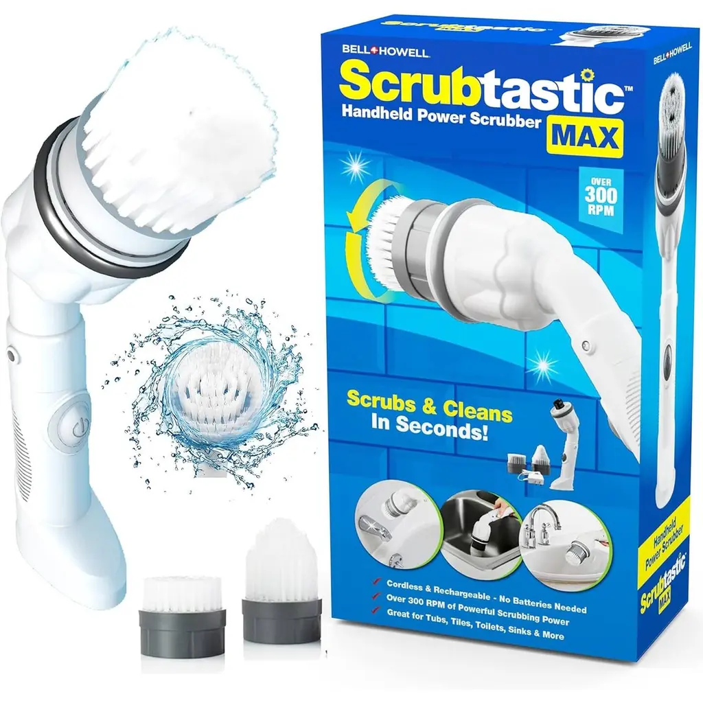 Bell + Howell Scrubtastic Max Handheld Power Scrubber is the newest innovation in bathroom scrubbers. It features a spinning head with 2 different interchangeable scrubbers to suit your cleaning needs. The high-torque spinning action coupled with the quality head fibers remove limes, water stains, rust and calcium deposits.THE ORIGINAL CORDLESS SPIN SCRUBBER - use the power of motion to get a deep clean with less effort. Scrubtastic multi-purpose powered cleaning tool uses over 300 RPM to scrub away tough stains or dirt with ease in the bathroom, shower, on tile, grout and any other tough and hard to reach surfaces. CORDLESS & RECHARGEABLE - Cordless scrubbing makes cleaning a breeze and hassle-free. Plug-in and charge the Scrubtastic for quick and easy cleaning experience 2 BRUSHES INCLUDED - surface brush for, well flat surfaces: and the larger round brush for bigger jobs or smooth surfaces like bathroom tiles. For best results, use in conjunction with your favorite cleaner to make tough cleaning jobs simple! NEW IMPROVED FOR 2022 - Larger 2000mAh battery and increased torque for better performance - get 30+ minutes operational power with 20% longer battery life and better cleaning results with 15% improved torque! Includes: scrubtastic max scrubber, flat brush head, grout brush head, AC adapter charger
