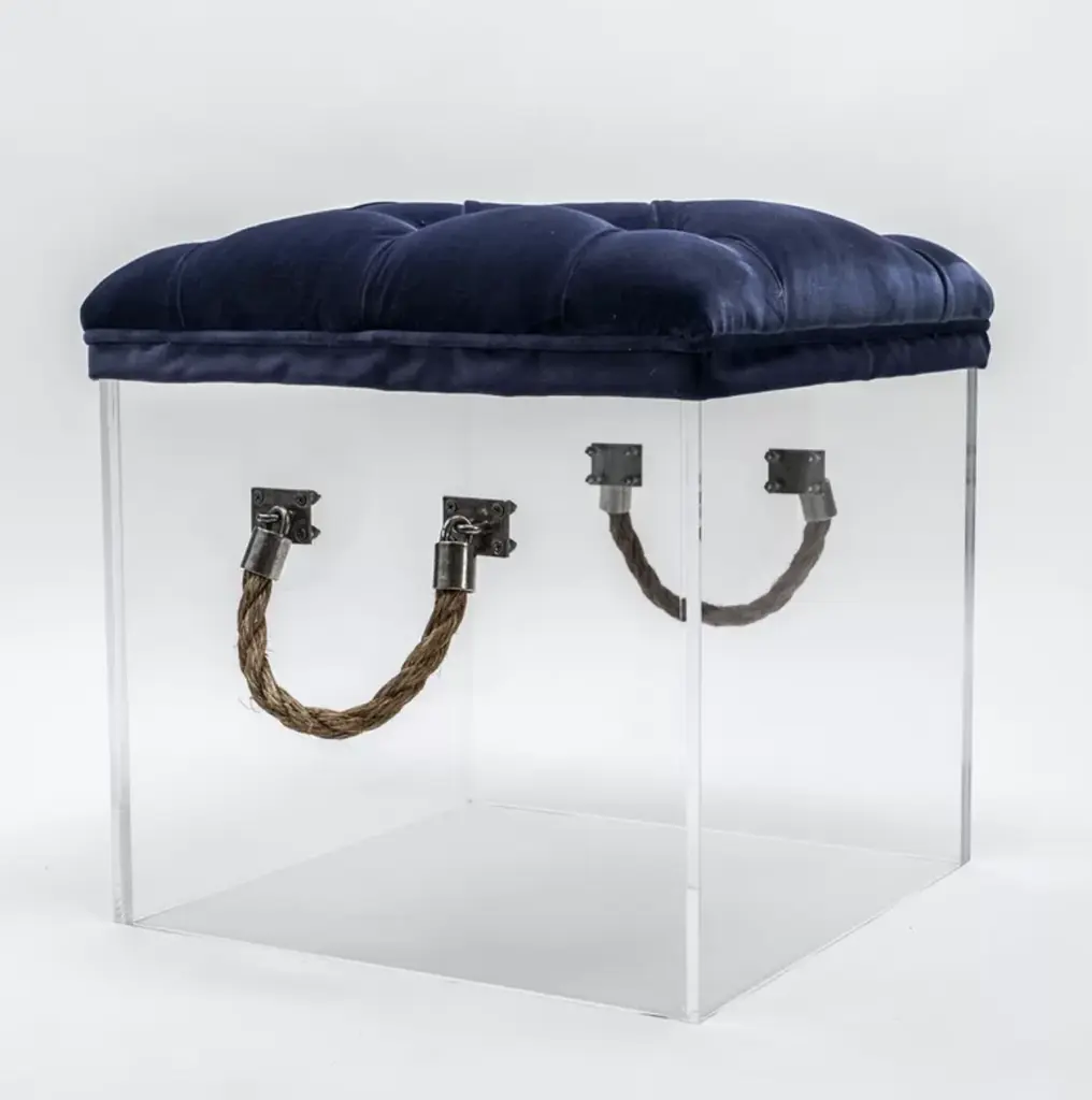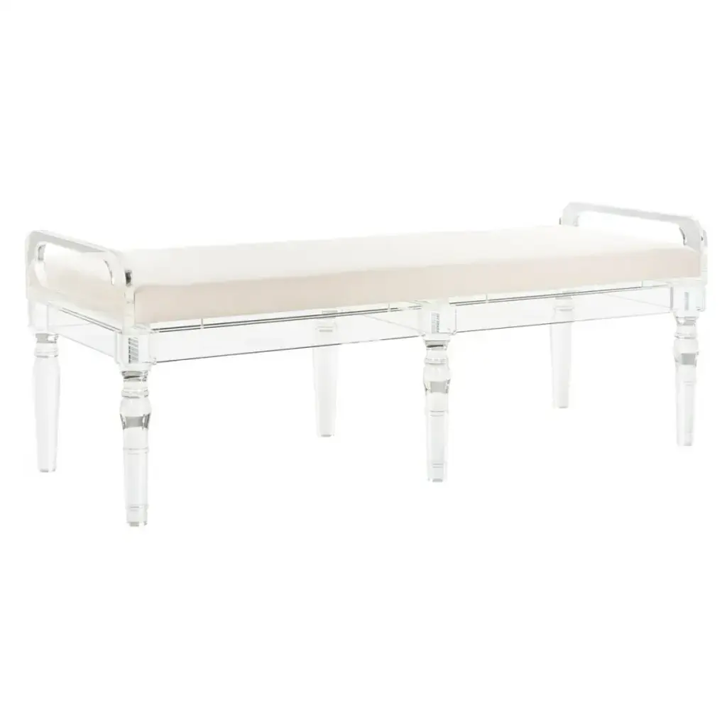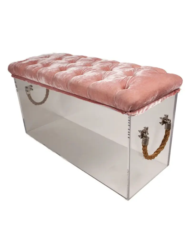 Jamie Dietrich brings you a beautiful acrylic upholstered bench upholstered in luxurious brown linen. This item features handles in your choice of leather, rope or horn. Can be used as a Bench or Coffee Table. Upholstery Color: Brown Upholstery Material: Linen 35" W x 13" D x 19" H Handle options: Leather (Copper or Nickel) Rope (Copper or Nickel) Horn (White, Frost, Silver or Gold) This item is made to order and includes free white glove delivery and assembly in the room of your choice! Delivery within 5-6 weeks of purchase. Made in the U.S.A.