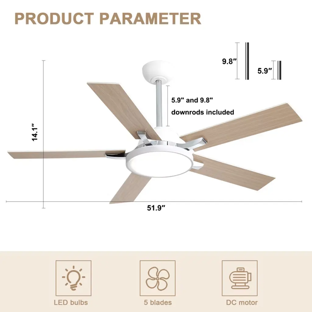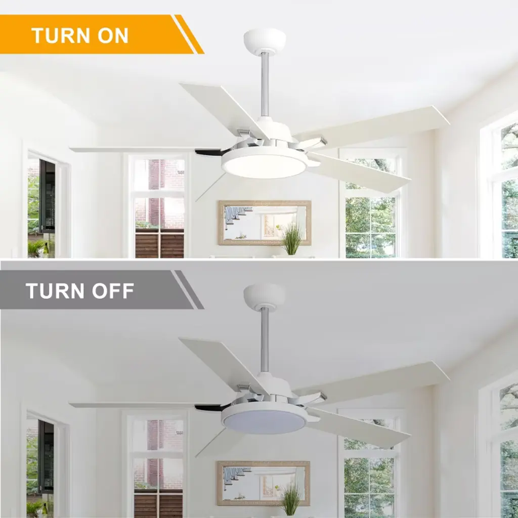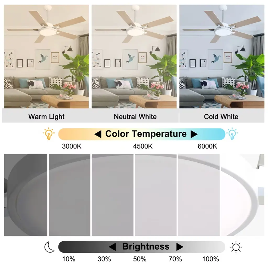Meet the Modern 52" Ceiling Fan, a stunning addition that effortlessly elevates any room it graces. Boasting eight expansive fan blades and integrated LED lighting with adjustable brightness settings, this fan seamlessly blends style and functionality. With six speed options and a convenient reverse function, it ensures year-round comfort at your fingertips. Take charge with the user-friendly remote control, allowing you to independently adjust both the light and fan settings. Complete with three suspension rods of varying lengths, this fan offers versatile installation heights to suit your unique room dimensions. Ideal for large spaces and adaptable to traditional, modern, or industrial decor styles, this fan effortlessly marries aesthetics with practicality, making it a standout choice for your home.