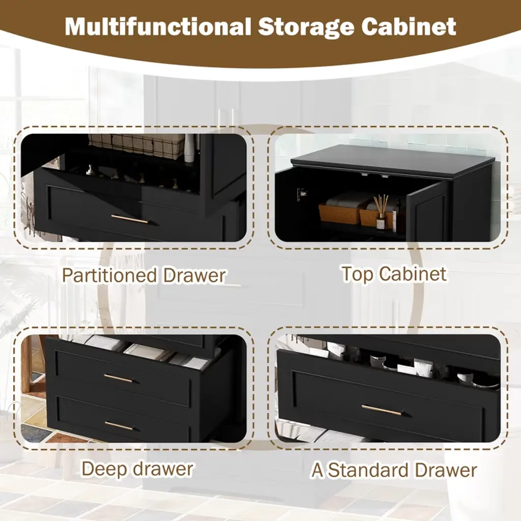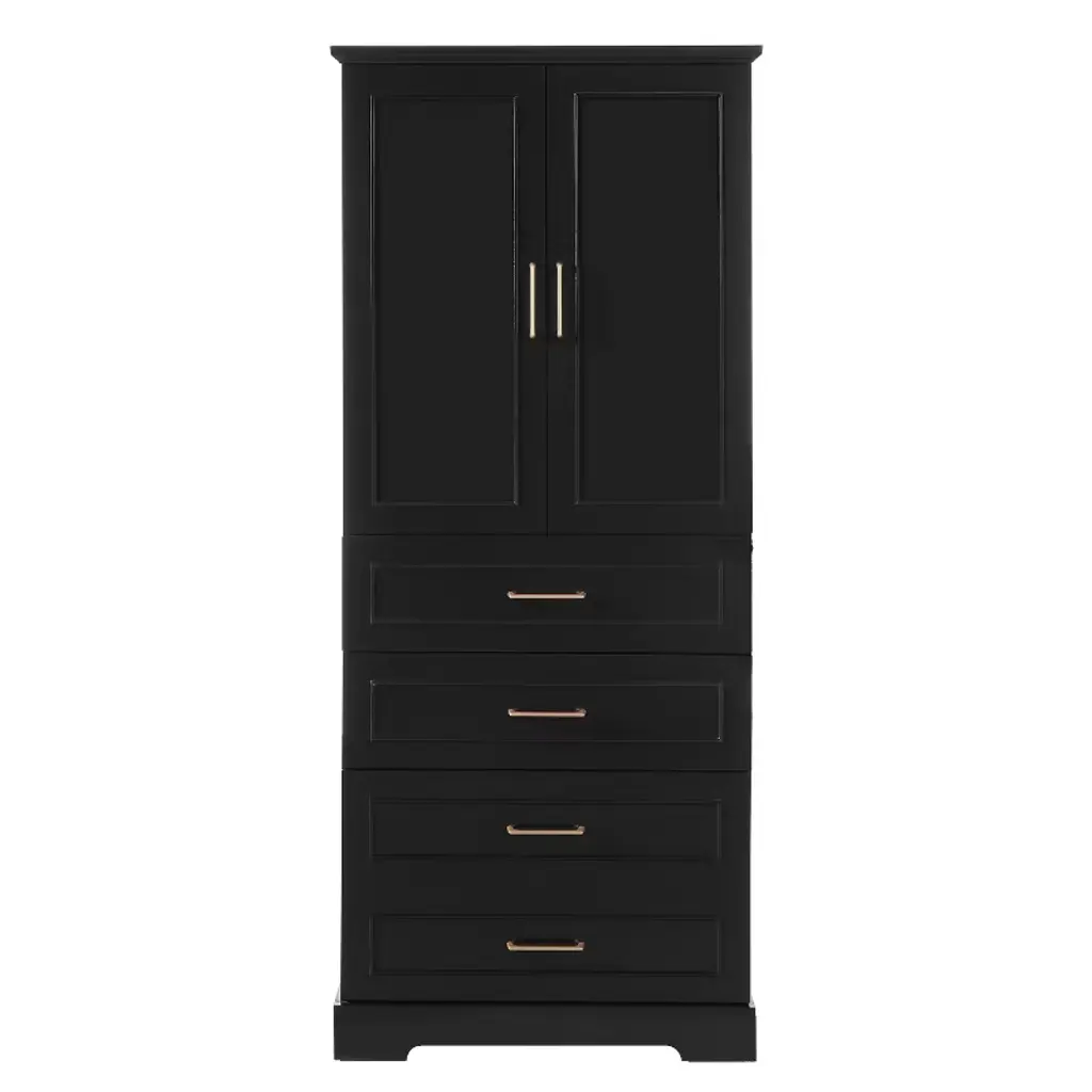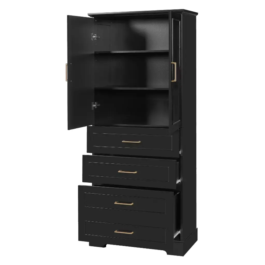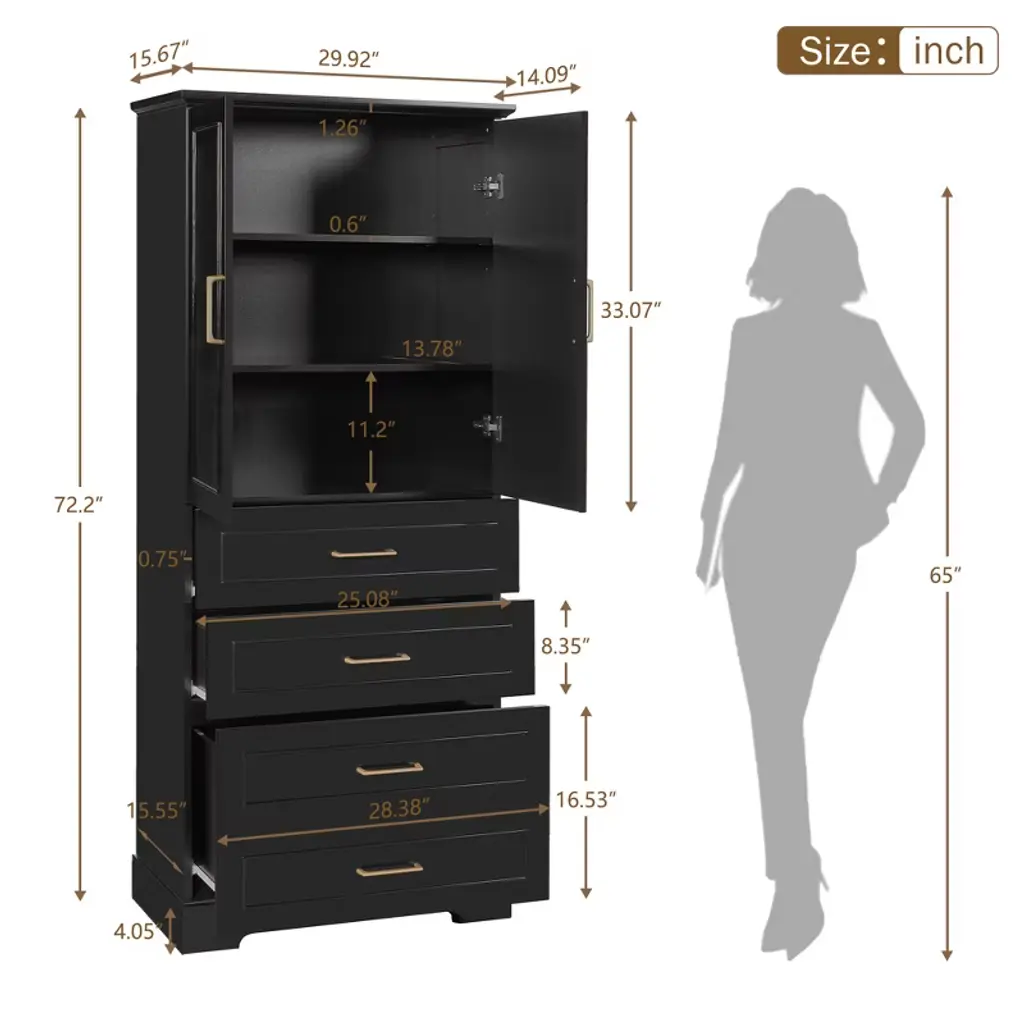 Transform your bathroom with this elegant Freestanding Bathroom Cabinet, designed to offer both style and practical storage solutions. Standing at 72.2 inches tall, it features three drawers—partitioned, standard, and deep—along with one fixed and one adjustable shelf behind chic soft-close doors. Made from high-quality MDF, this cabinet is built to withstand humid environments while enhancing your decor with its sleek black finish. The cabinet comes equipped with an anti-tip kit, ensuring safety for families, and the soft-close hinges minimize noise for a serene atmosphere. This breathtaking cabinet will not only declutter your space but also elevate your bathroom's aesthetic with its contemporary design.