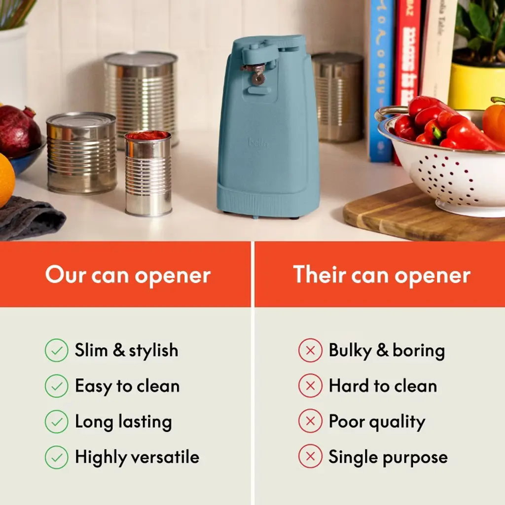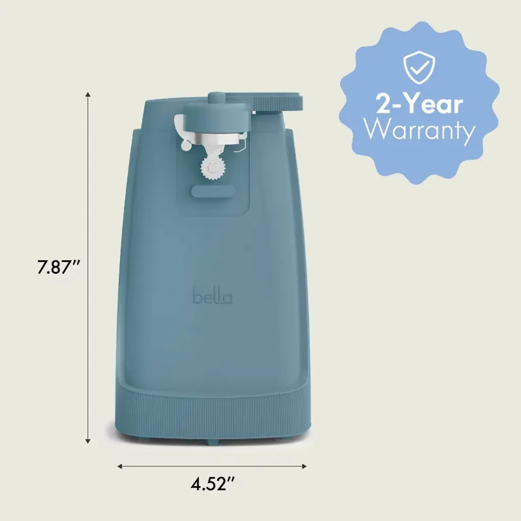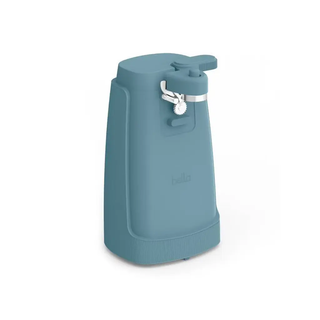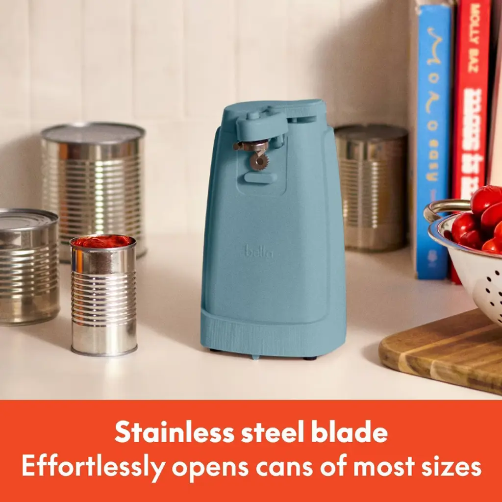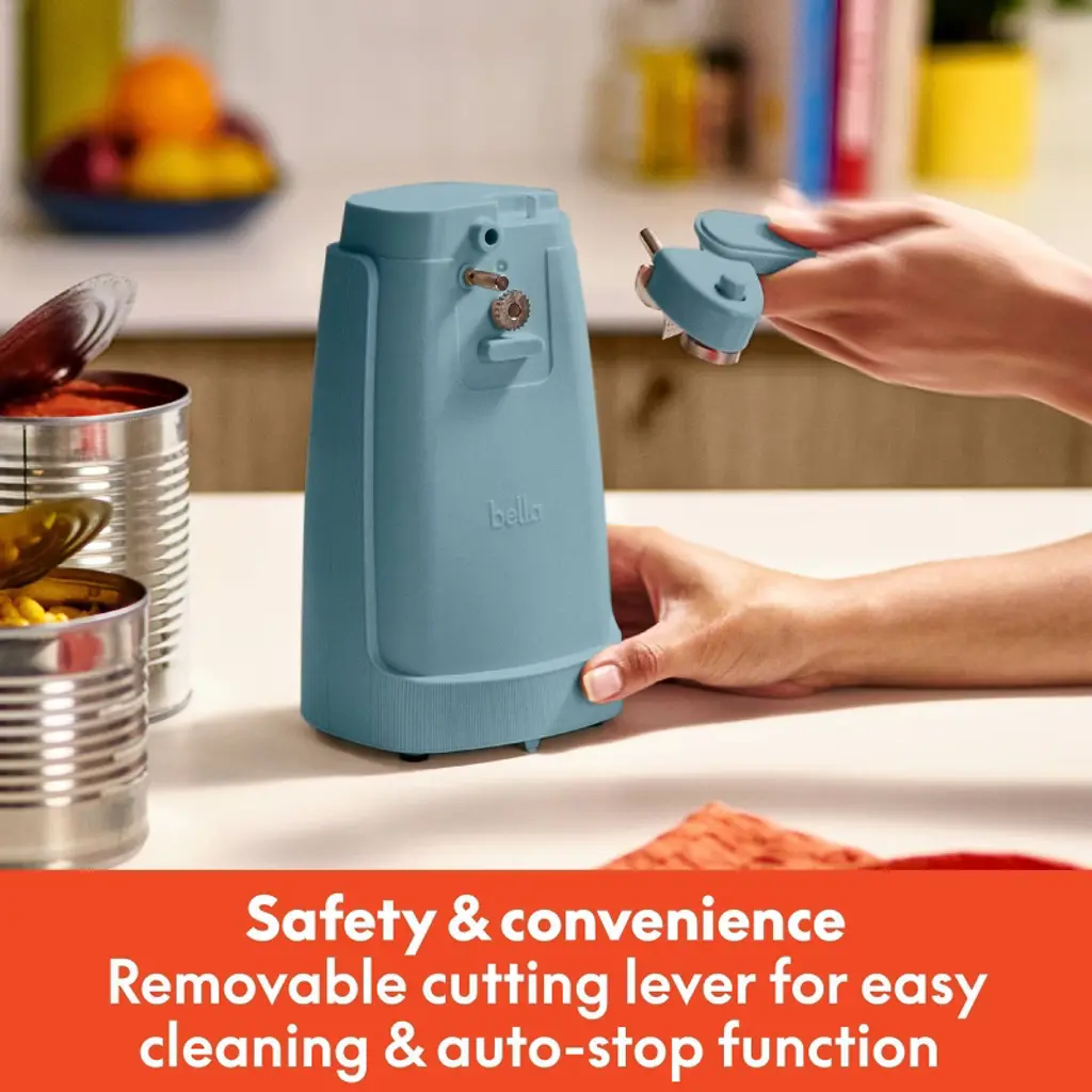 Pantry staples, meet your match. The bella Electric Can Opener opens cans, bottles and jars of all sizes with one simple touch. This sleek and powerful can opener makes opening cans a breeze with a stainless steel cutting blade, capable of handling cans of most all sizes. Its magnetic lid holder ensures a steady grip while cutting, while the one-touch operation with auto-turn feature gives you hands-free convenience. This handy can opener also includes a removable lever for easy cleaning and has a built-in knife sharpener making it a true workhouse in your kitchen. A convenient cord storage compartment makes it easy to tuck away when not in use.