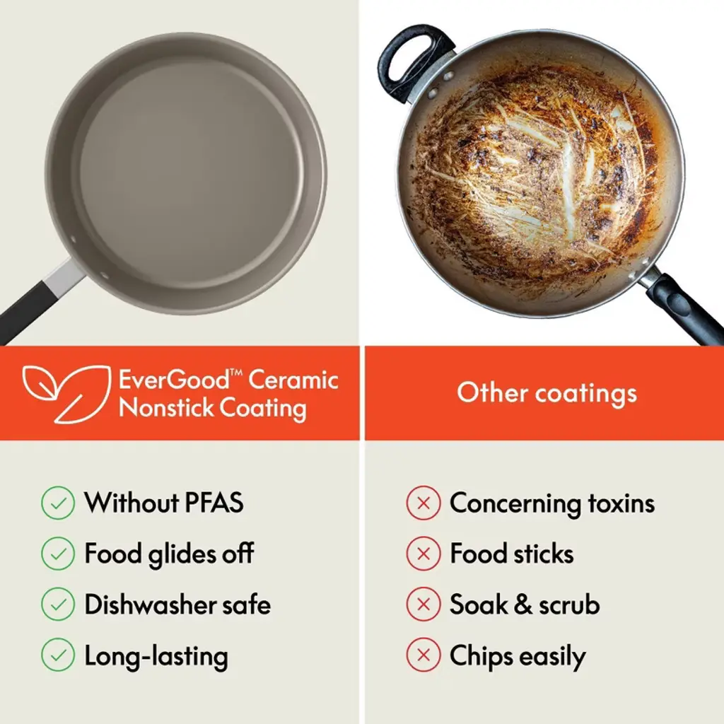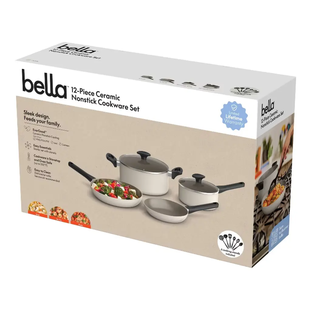 Need to upgrade (or downsize) your cookware? The bella 12-Piece Ceramic Nonstick Cookware Set is that perfect medium - not too big, not too small and just right. Made for home chefs that want performance and style, this set includes: 8” fry pan; 10” fry pan; 2qt covered saucepan; 5qt covered Dutch oven; and 6 nylon tools for your daily cooking tasks. Our cookware features our EverGood™ Ceramic Nonstick Coating that’s made without PFAS, PFOA, PTFE, lead and cadmium. It is oven safe to 350°F and safe for all cooktops, including induction.