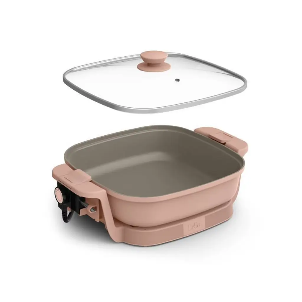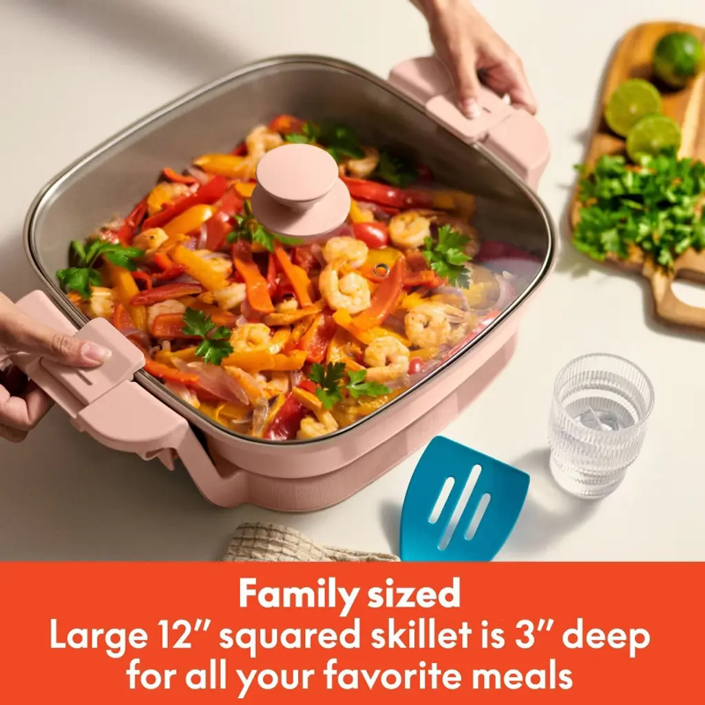 Part of the bella Fits-anywhere™ kitchenware system, the Make & Take Electric Skillet has an inverted lid design that locks in place so you can store the skillet on its side to maximize storage space. The large squared skillet is 3” deep, making it great for cooking chili, casseroles and other potluck favorites. It has a robust cast aluminum base for consistent, even heating. The sturdy clamps hold the lid securely, making it easy to transport.