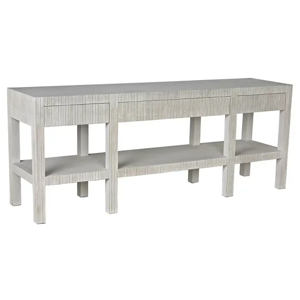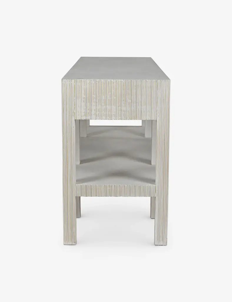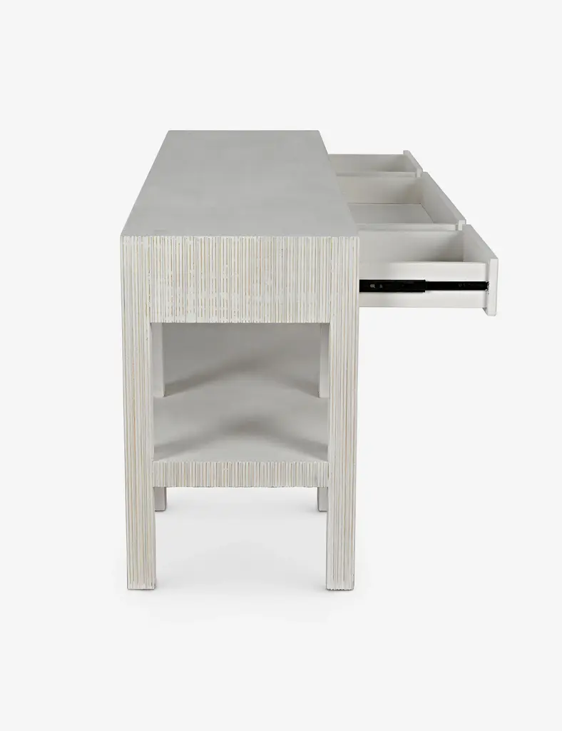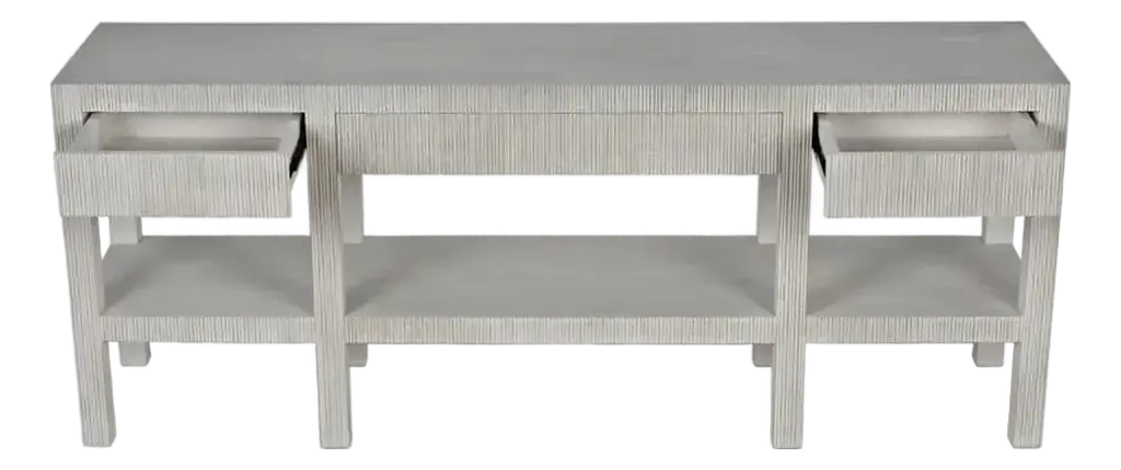 We love the juxtaposition of a clean-lined silhouette and fluted textural detail in the Bellinger console table. Its three drawers and an open lower shelf offer plenty of space for storage and display. Handcrafted with mahogany, this piece makes a stunning entryway or sofa table.