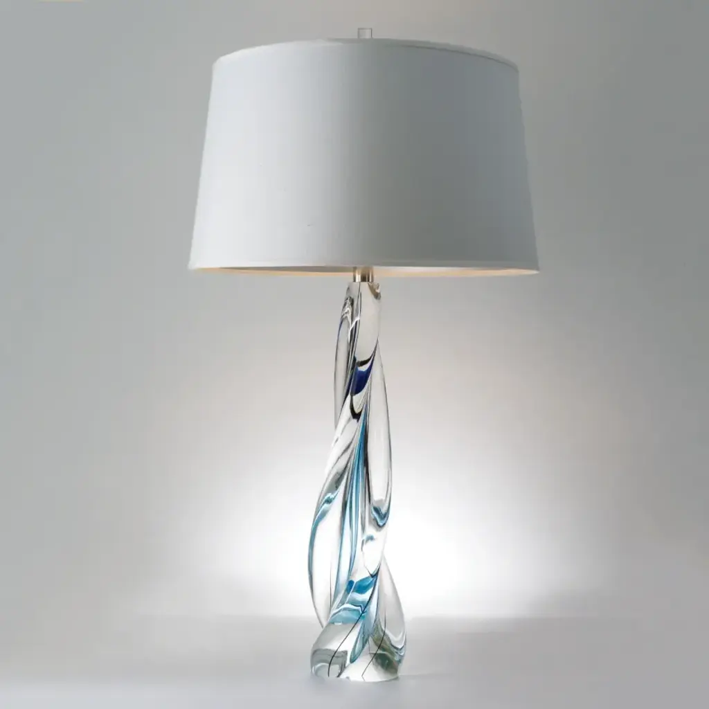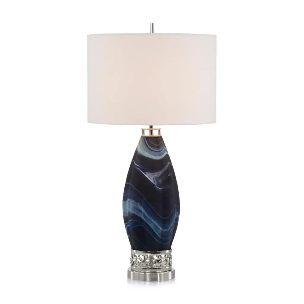 The Belluci Lamp showcases handblown Italian glass in a striking swirl of black and pale blue, accented by bands of faceted crystal detail. Elegant and expressive, it brings a touch of artistry to any interior.