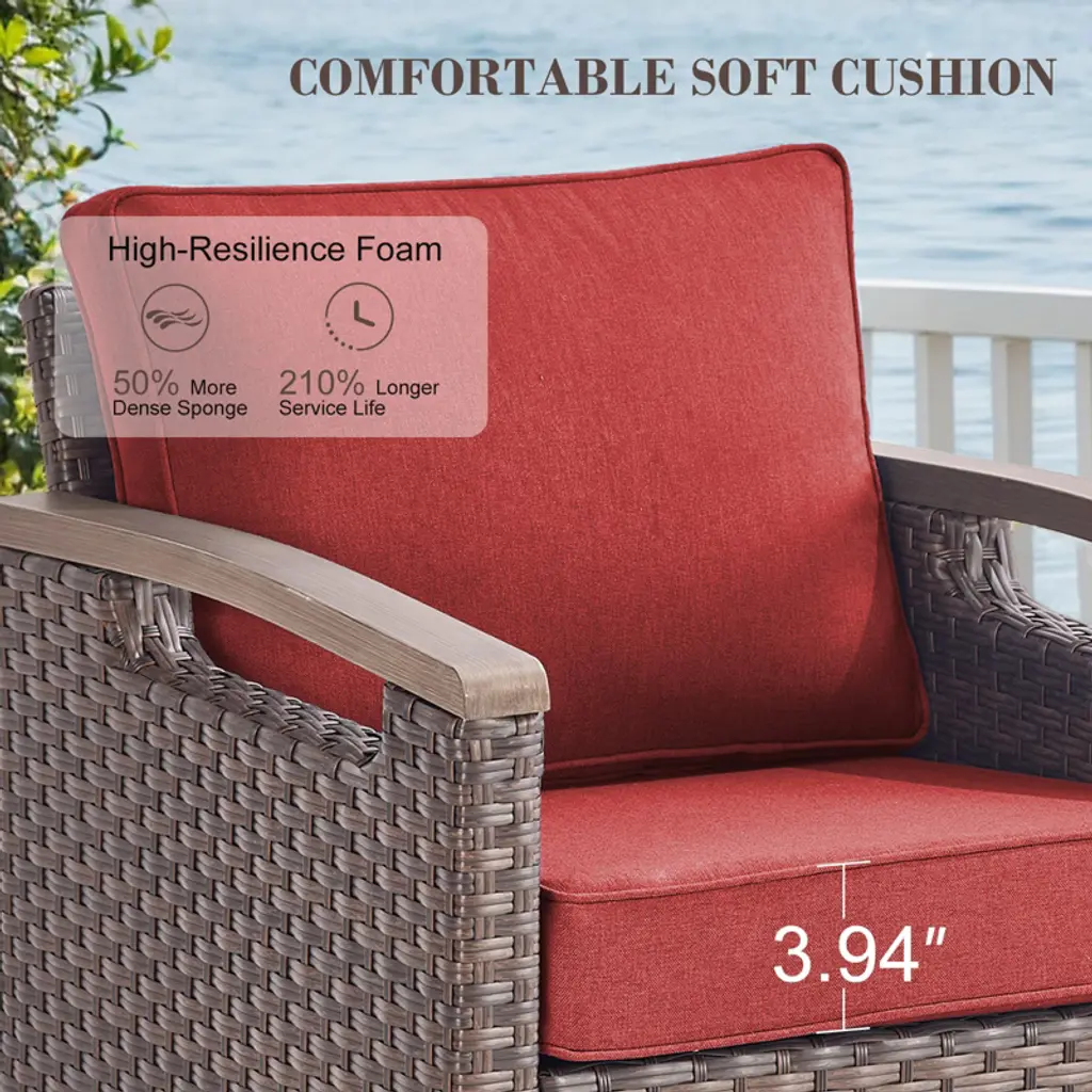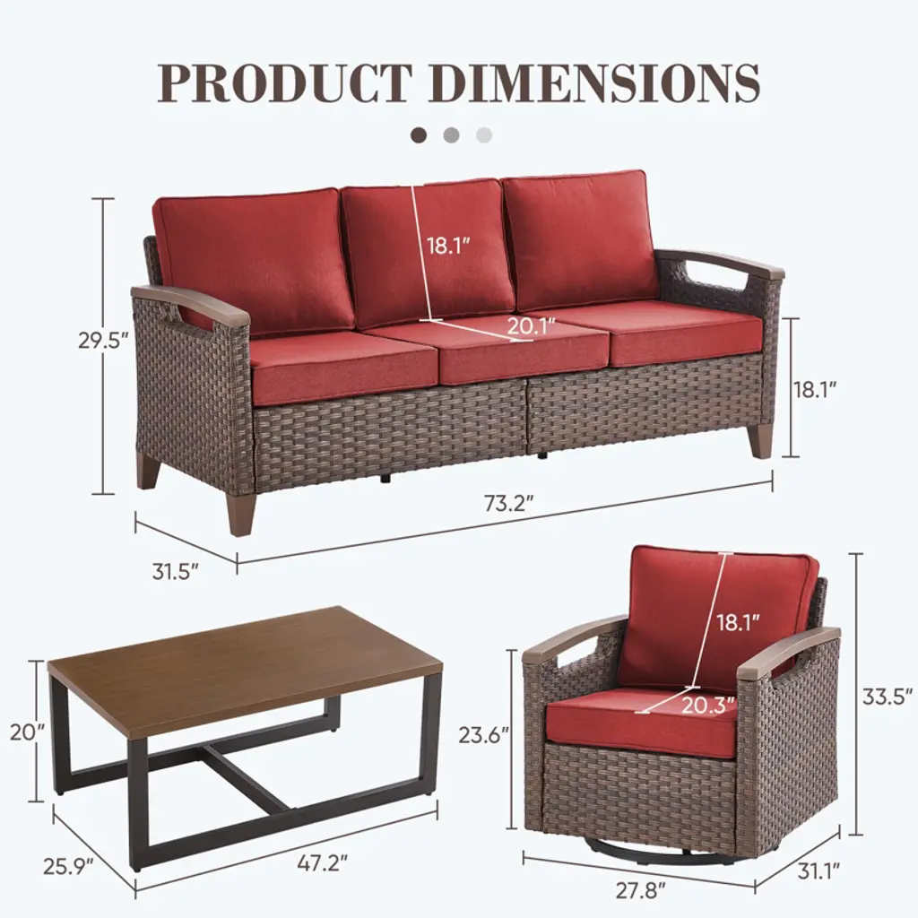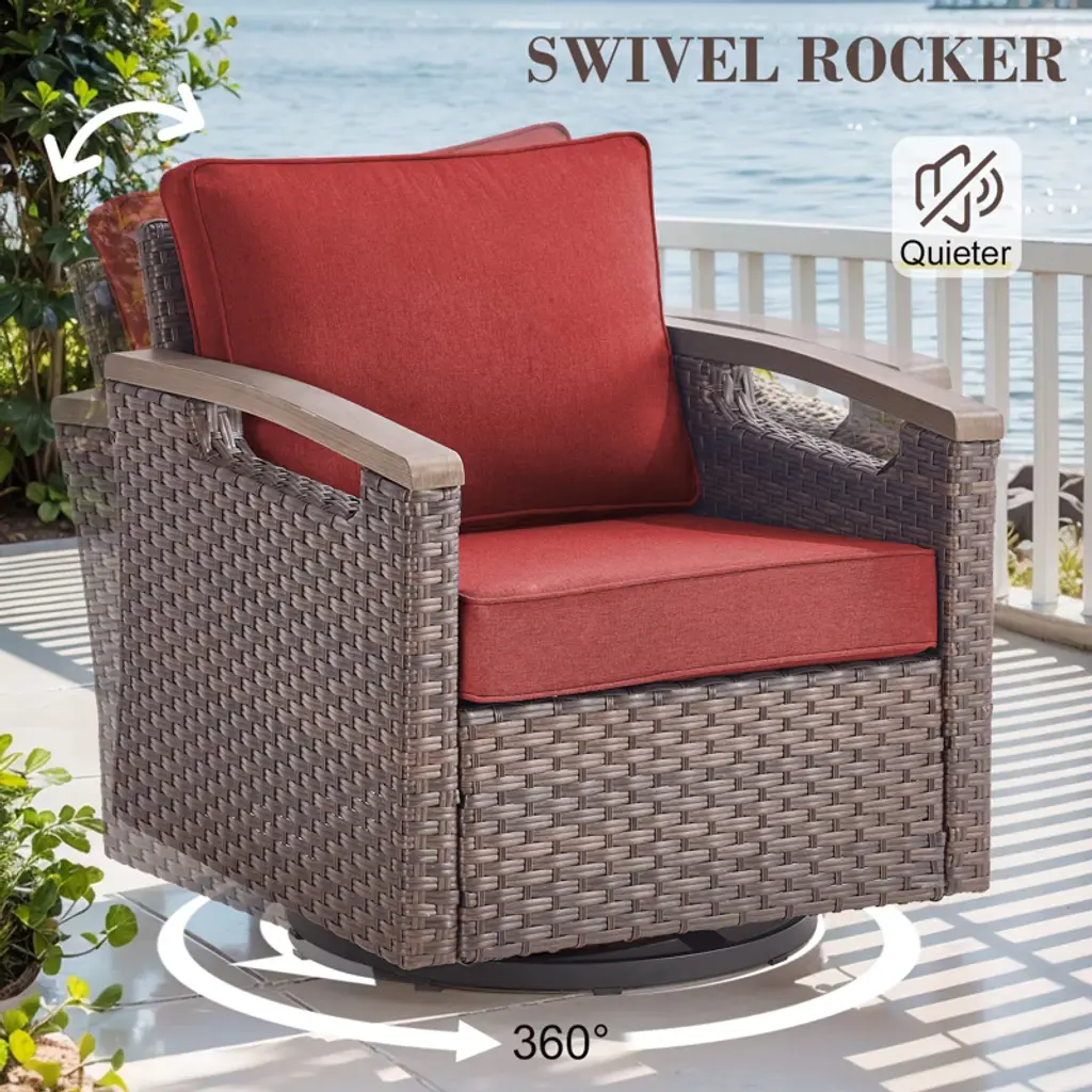 Upgrade your outdoor living with this stylish 4-piece patio furniture set, designed for both elegance and comfort. The set includes 2 swivel rocker chairs, a 3-seat sofa, and a coffee table, making it perfect for porches, patios, decks, or balconies. The chairs feature a 360¡ã swivel and smooth gliding motion for superior relaxation, while the premium powder-coated metal armrests with a hollow design add modern luxury and durability. Sink into ultra-comfort with 4-inch thick cushions filled with high-resilience sponge and doll cotton, wrapped in water-resistant Olifen fabric for lasting outdoor use. The handwoven PE wicker closely mimics natural rattan while being fade-resistant and built for long-lasting performance. With warehouses in both eastern and western US, we offer quick customer support and fast replacements for any issues. This chic, weather-resistant set combines luxurious design with superior comfort, making it ideal for creating a cozy yet sophisticated outdoor retreat perfect for relaxing, entertaining, or enjoying your morning coffee.