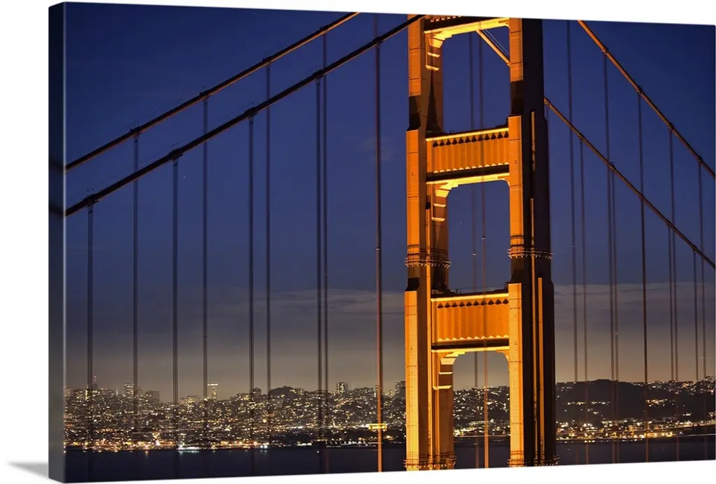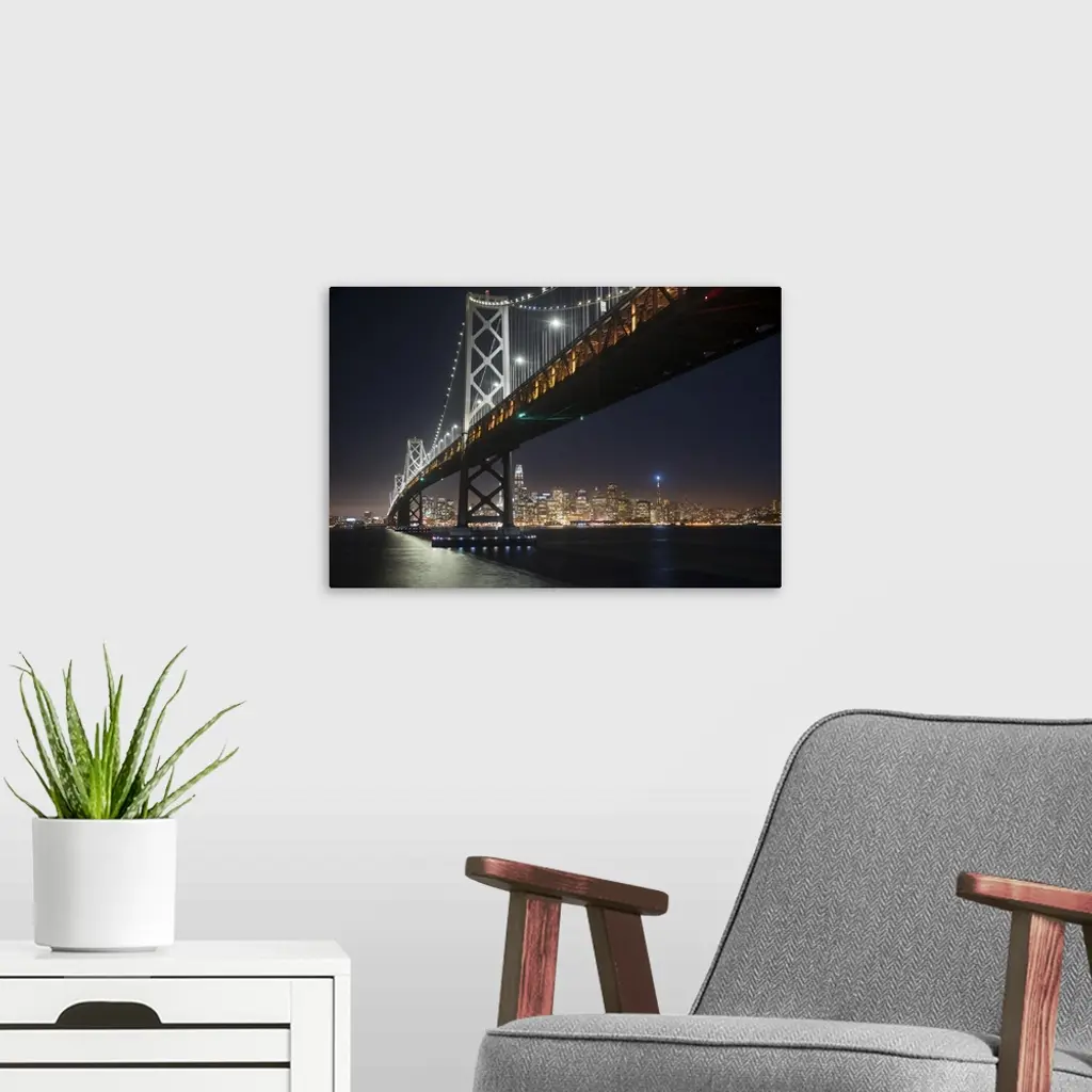 Photograph from below the Bay Bridge at night with the San Francisco skyline lit up in the background.