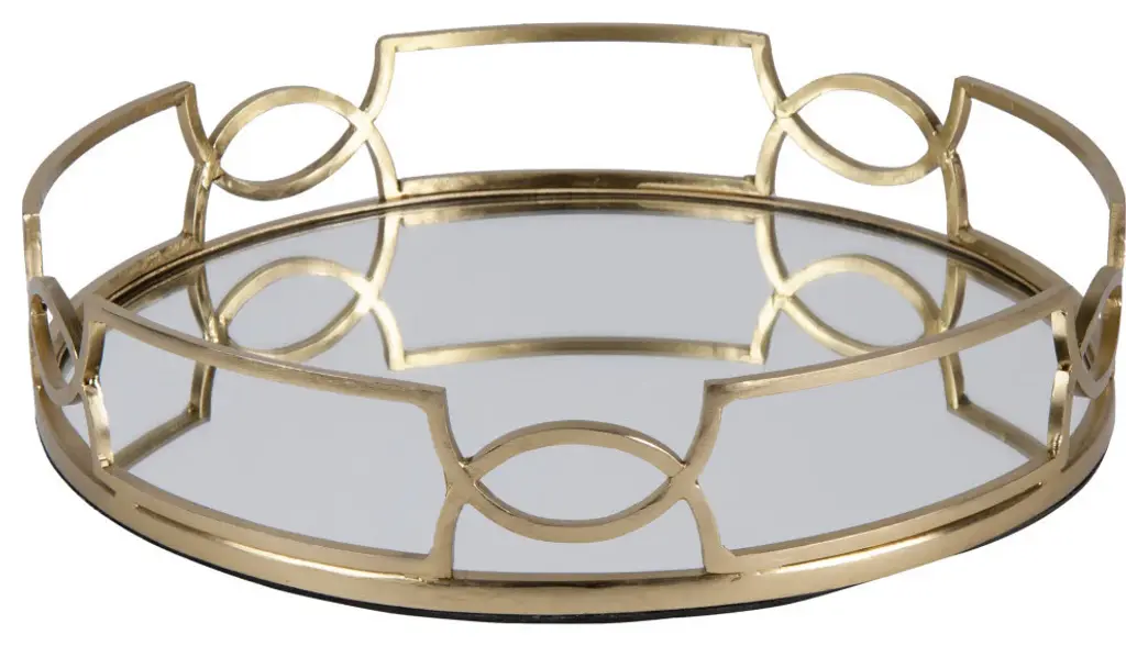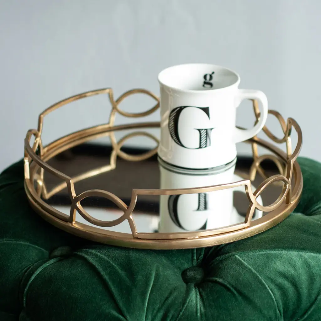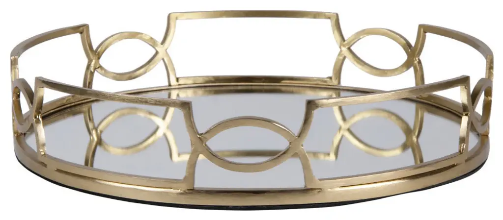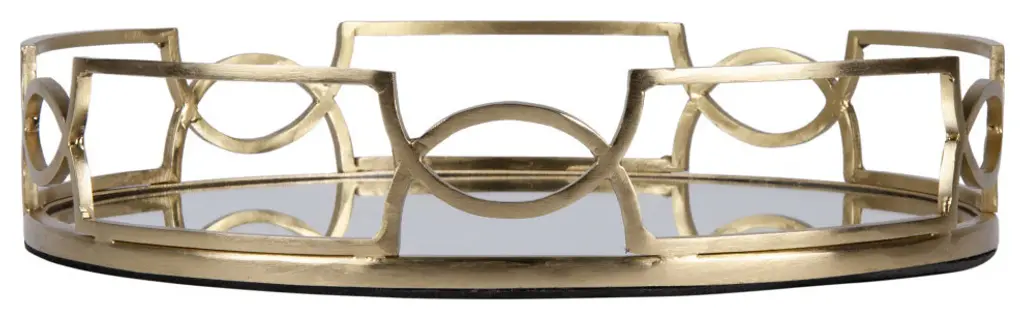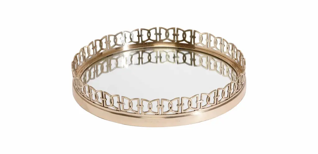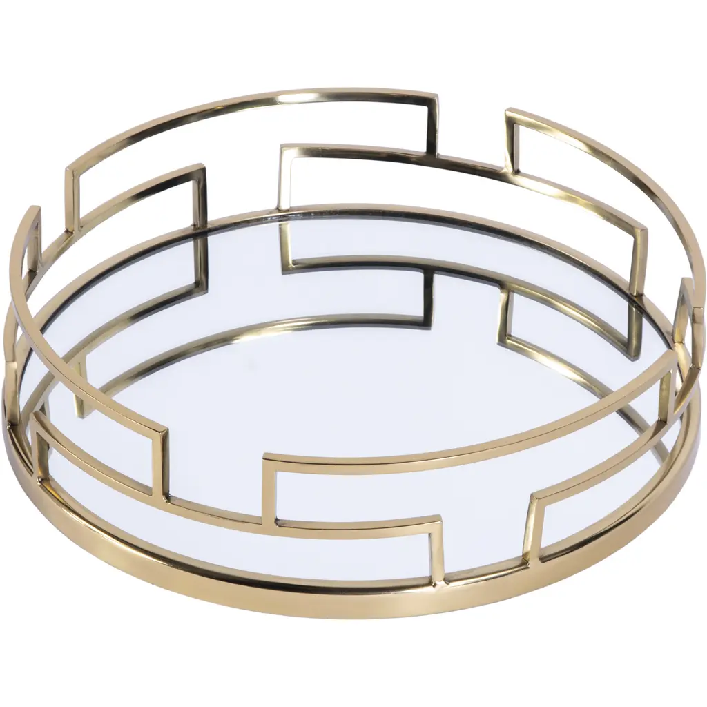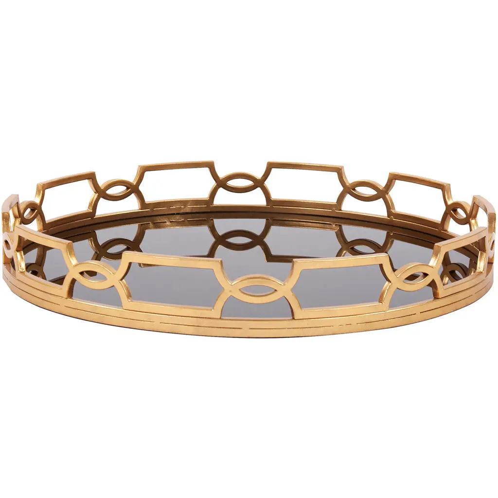 Intertwining function and formality, this tray design is just as powerful when set as a d�cor piece as it is in use. Featuring an iron antique brass-plated framework with a mirror in its center, it glistens and glows from every angle. With a 12-inch diameter it provides ample space for drinks or a display.