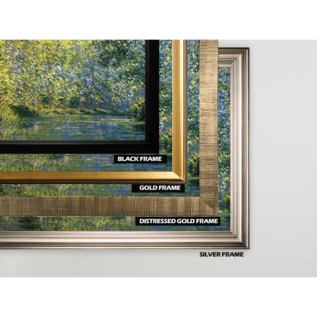 Bend-in-the-River -Claude Monet - Framed Premium Gallery Wrapped Canvas Silver Frame A premium hand wrapped Giclee canvas. 100-percent and created to last . Each frame is custom cut and mounted by hand and applied around a custom printed 24x36" hand wrapped giclee printed canvas. OVERALL SIZE : With Silver Frame : 30"x 42" ** Overall size may vary slightly from piece to piece Each piece is made to order. Built to Last Each piece comes ready to hang Shape: Rectangle Orientation: Horizontal Frame Material: Wood Subject: Landscapes, Sea & Shore, Impressionism Style: Traditional Season or Holiday: All Seasons Size: Large Frame Color: Silver