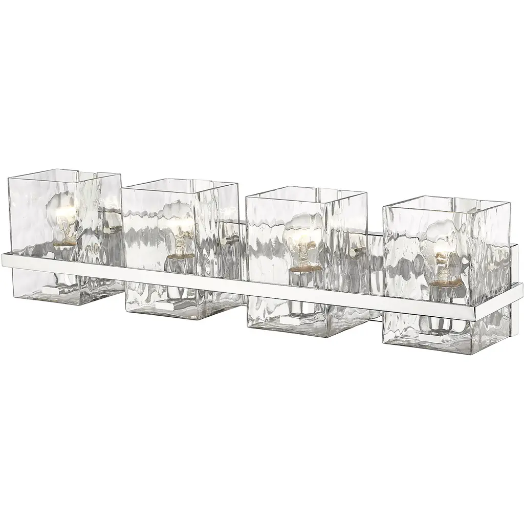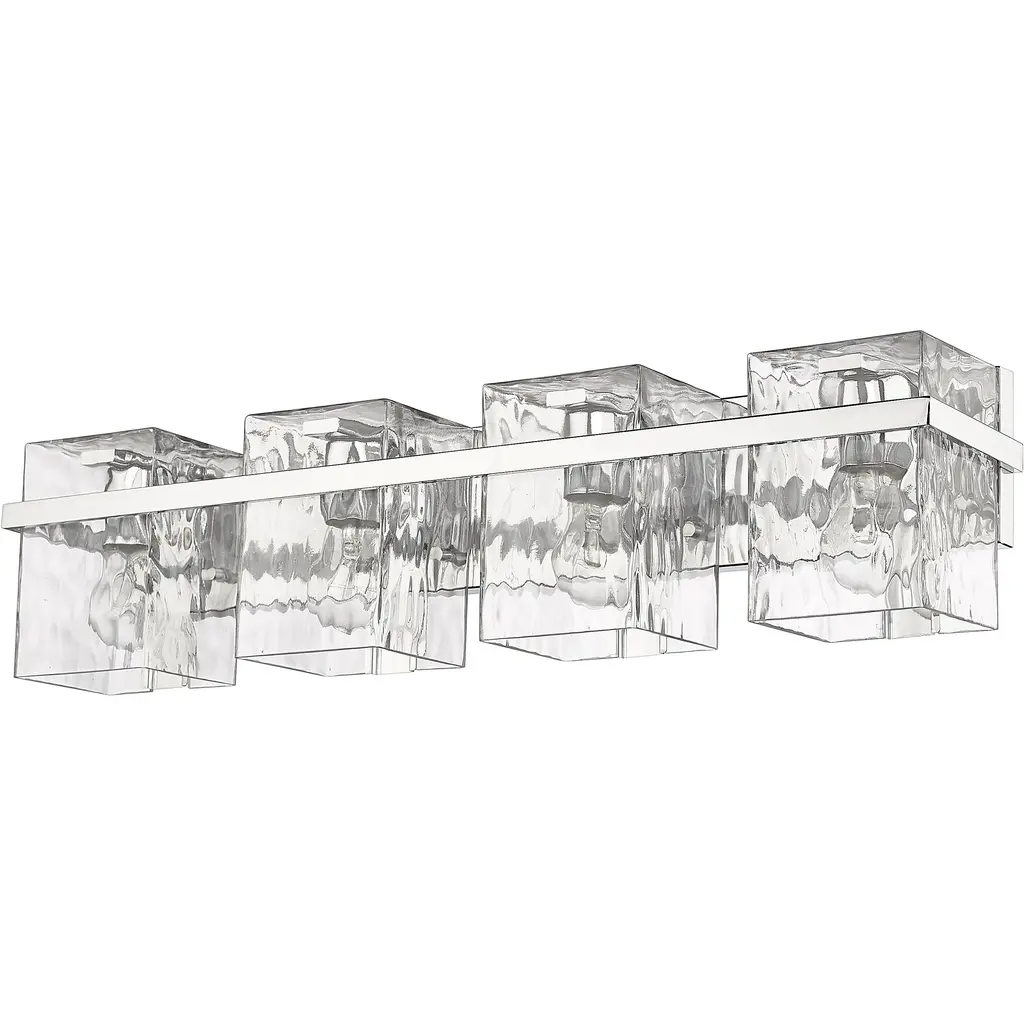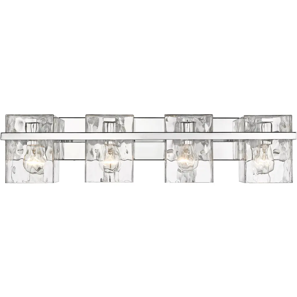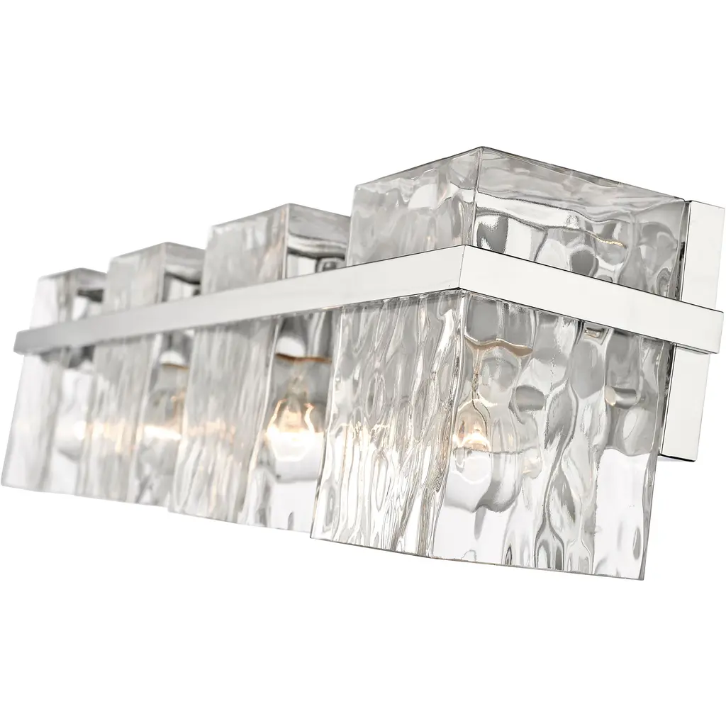 This four-light vanity light with clear glass shades brings a sophisticated expression for your bathroom lighting. Rippled shades provide an eye-catching texture while the steel construction is finished in chrome.