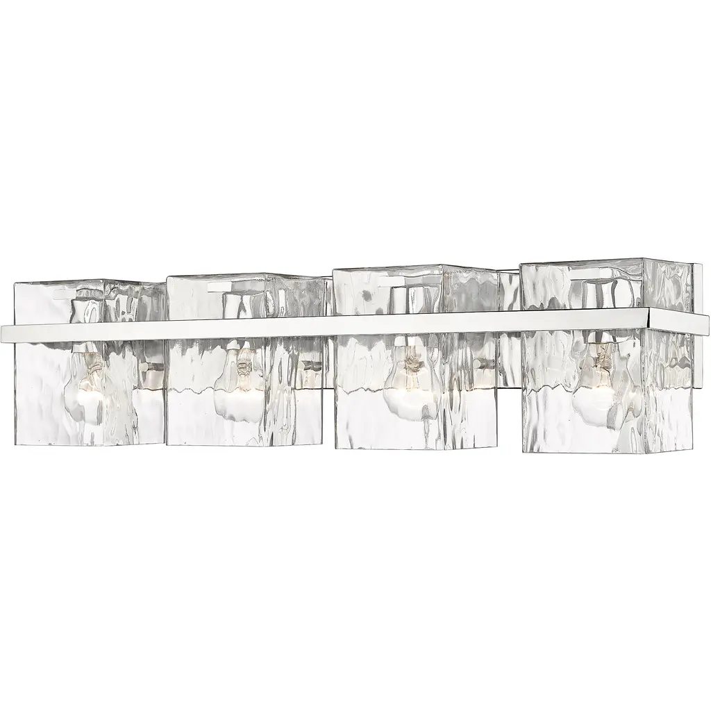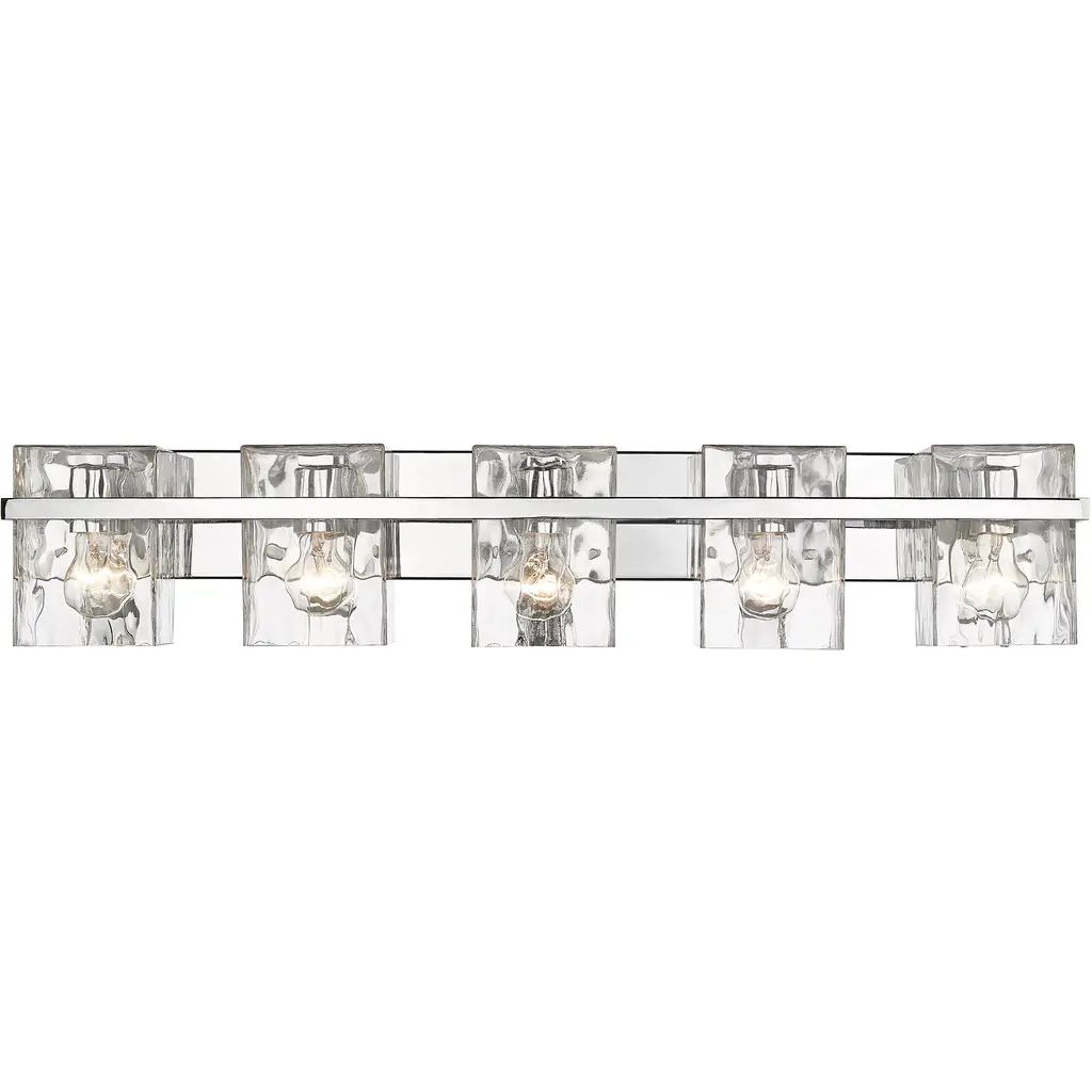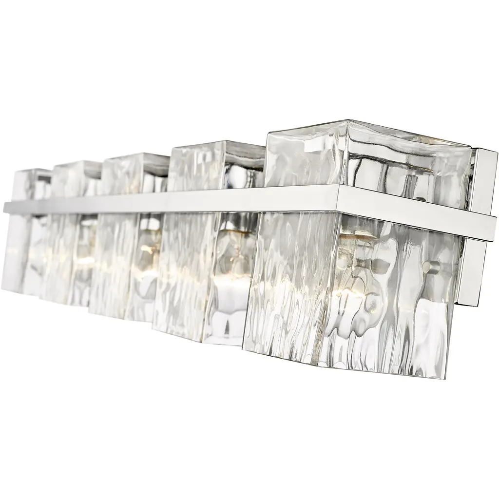 Rippled clear glass shades serve as a focal point on this five-light vanity. The fixture's steel is enhanced with a chrome finish while captivating with clean lines.