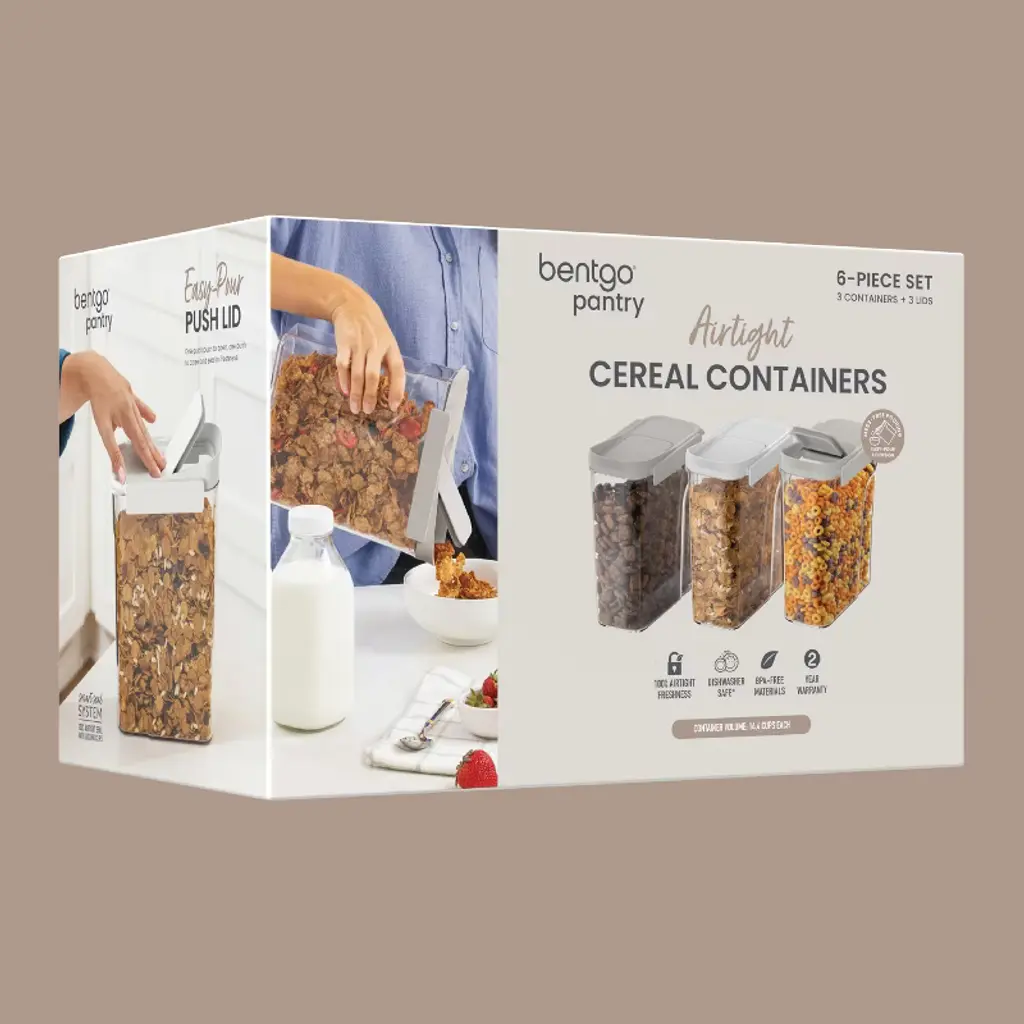 Elevate your kitchen and pantry organization with the Bentgo Pantry Airtight Cereal Containers! This 6-piece set includes 3 containers and 3 lids – perfect for storing dry goods like cereal, oatmeal, granola, popcorn, trail mix, and more. With airtight lids featuring secure locking clips and a push-to-open design, your food stays fresh, and the easy-grip handle ensures smooth, mess-free pouring during busy mornings. Crafted from durable, crystal-clear plastic, these containers are both odor- and stain-resistant, offering a glass-like transparency that lets you quickly spot what's inside – perfect for those moments when you need to pour food in a rush! There is also a space at the bottom to write dates, making it easy to track expiration dates and contents while helping you stay organized and efficient. With a space-saving stackable design, your pantry and countertops will look tidy and well-organized. Say goodbye to clutter and hello to fresh, neatly stored food with Bentgo Pantry.Space-Saving Design: stackable containers allow for space-saving organization of your kitchen, pantry, or countertops. Easy-Pour Lids & Design: The push-to-open lid and easy-grip handle provide smooth, effortless pouring every time.Durable Crystal-Clear Plastic: Transparent glass-like clarity makes it easy to see what’s inside while also being stain and odor-resistant, and BPA-free. Airtight Freshness: Each container is designed with airtight sealed lids and secure locking clips to keep food fresh longer.Easy-Open Clips: Maintain the freshness of your pantry staples with the easy open and close locking clips that snap right into place.