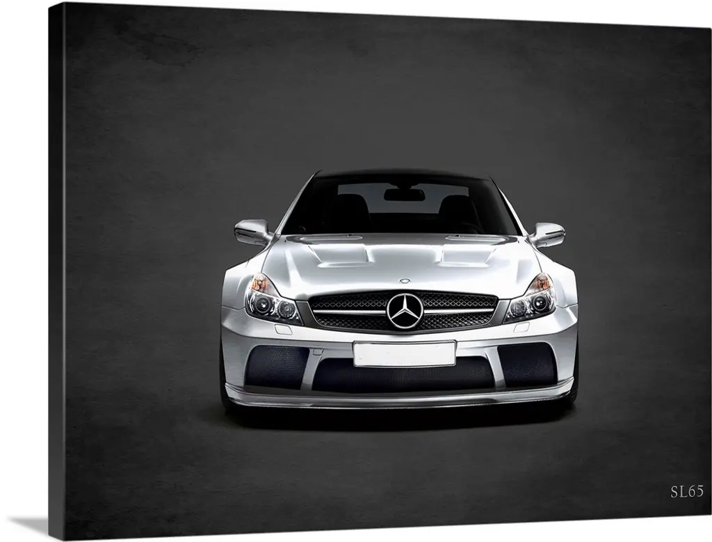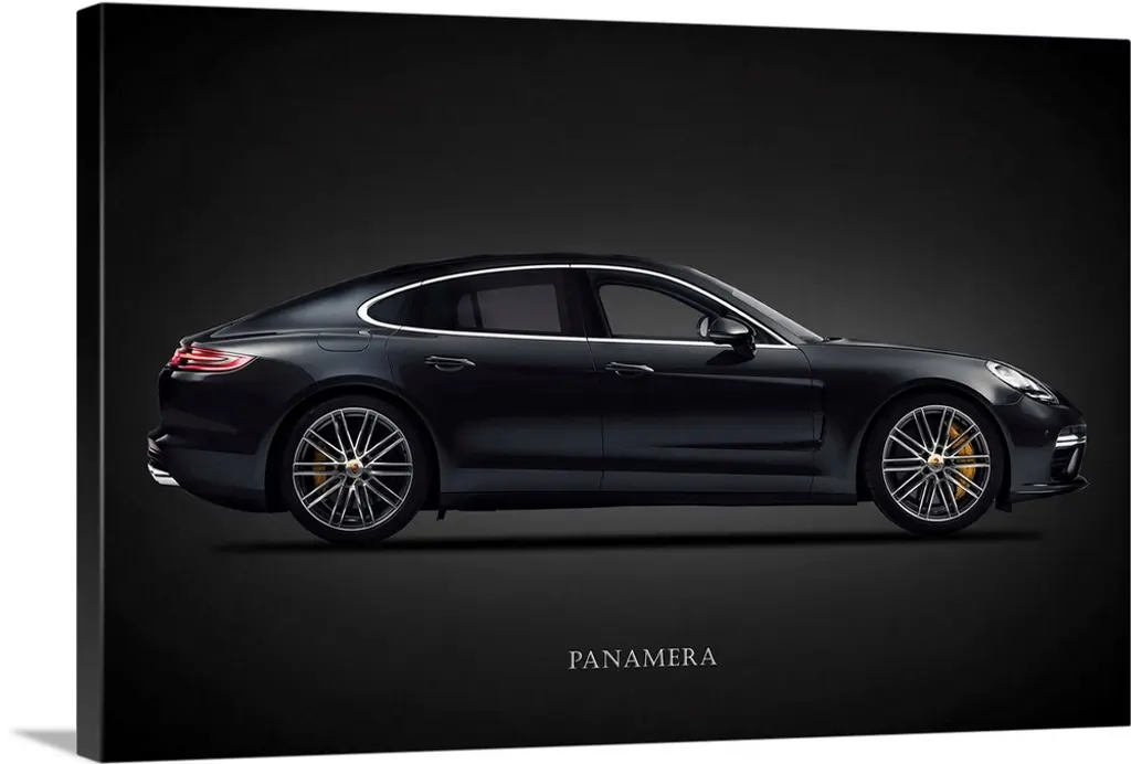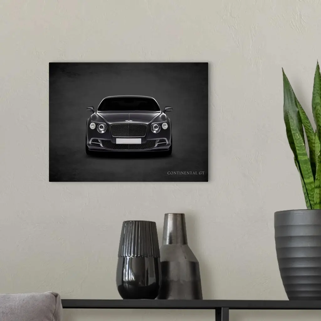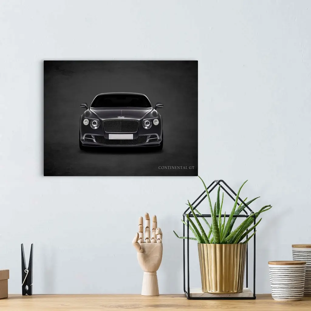 Photograph of a black Bentley Continental GT printed on a black background with a dark vignette.