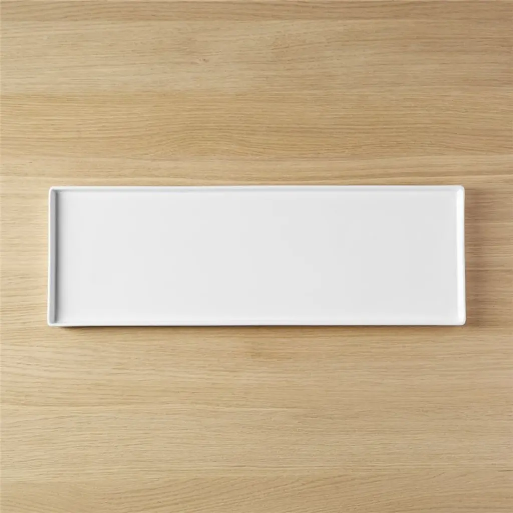 Long slim span of white stoneware with three-quarter-inch raised rims adds simple edge from every angle. Serve a square meal with Bento dinnerware. bento rectangular platter is a CB2 exclusive.