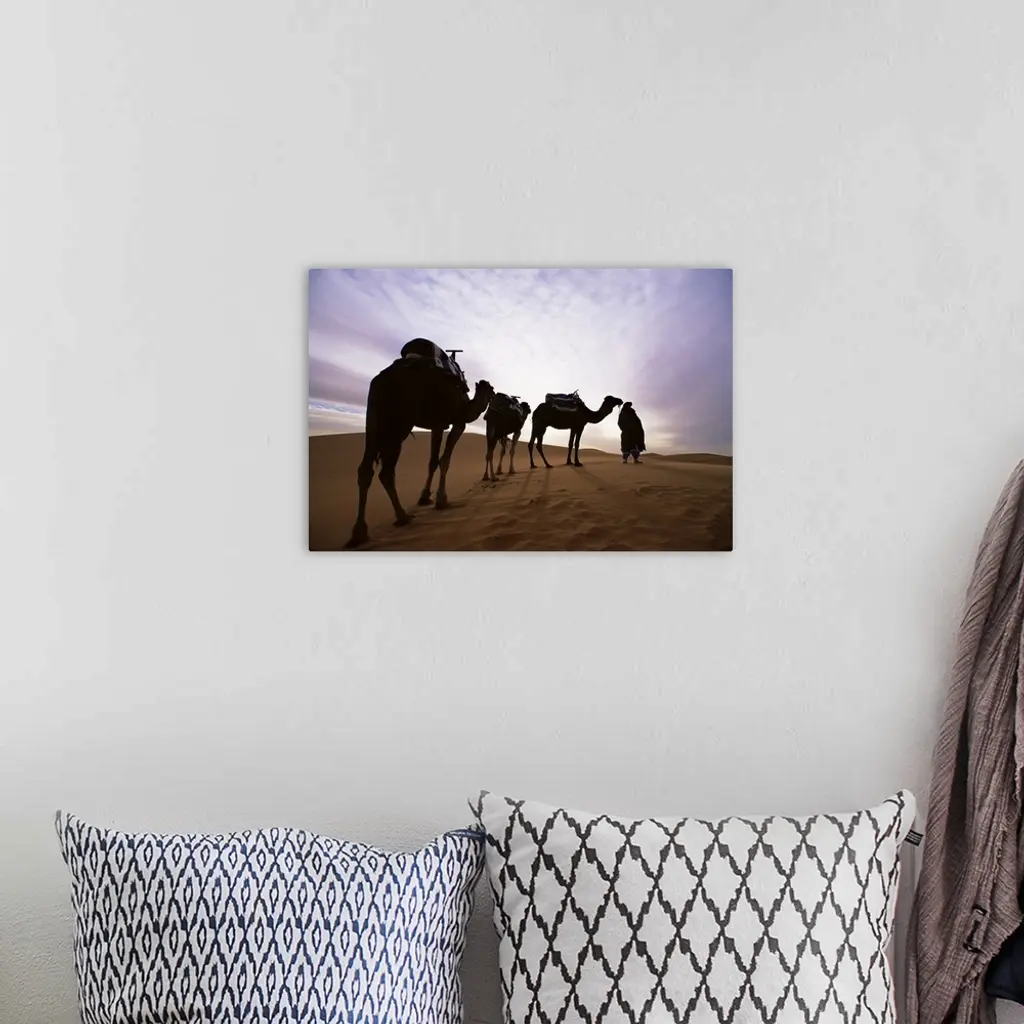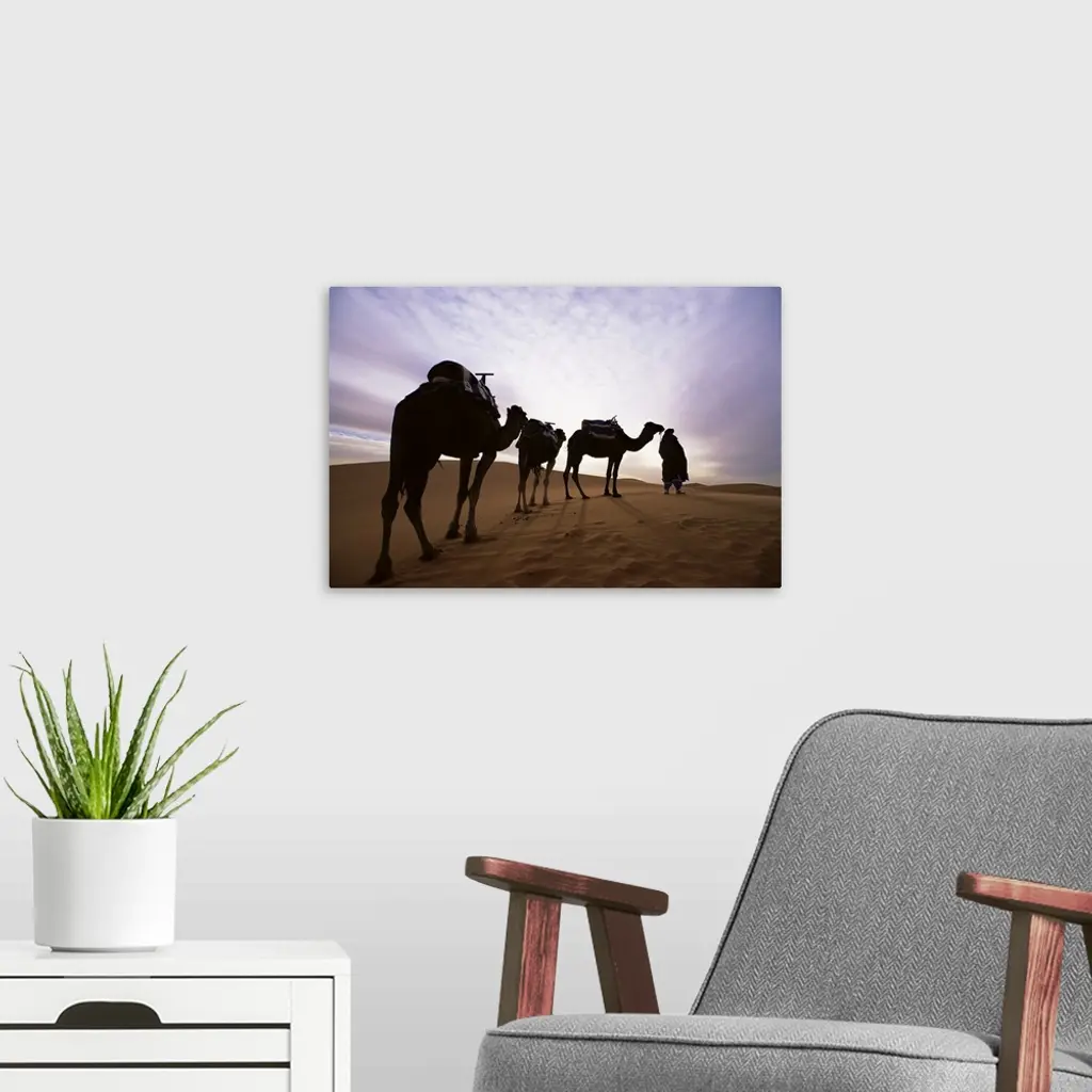 Berber camel leader and camels in Erg Chebbi sand sea, Sahara Desert, Morocco wall art for home and office decor. Discover canvas art prints, photos, mural, big canvas art and framed wall art in GreatBigCanvas.com's varied collections.