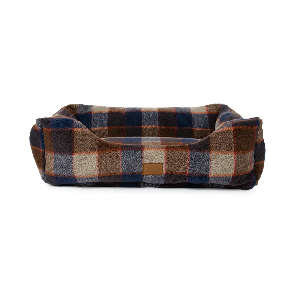 Upgrade your dog's bed with the Pendleton Berber Kuddler! Made with non-shearing berber and overstuffed with recycled MemoryFiber™, this bed offers maximum support and comfort perfect for home, kennels, or road trips. The removable, machine-washable cover features a blue and brown plaid design inspired by mountain peaks. Suitable for most pets, but consider sizing up for extra room. Highlights