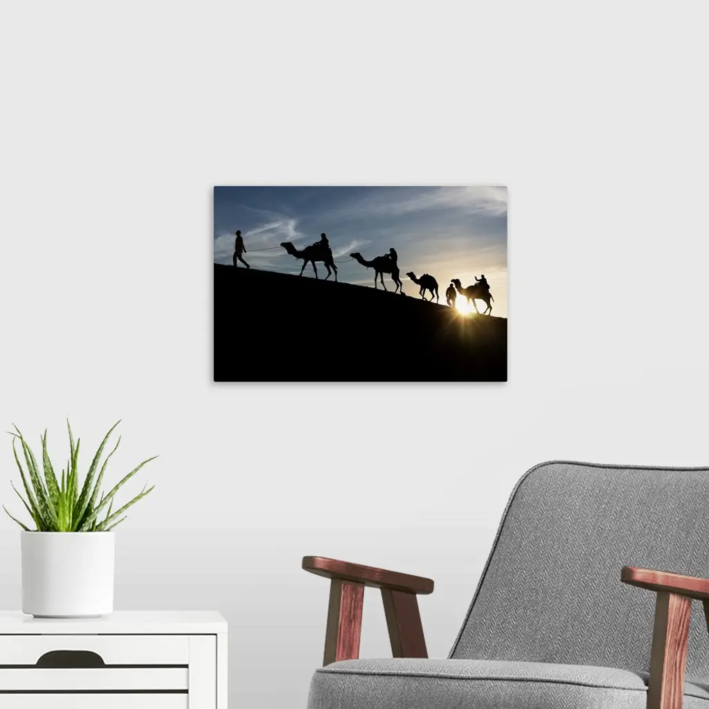 Berber Silohuette at the sunstet in the sand dunes with dromedary, Sahara desert, Tunisia, Northern Africa.