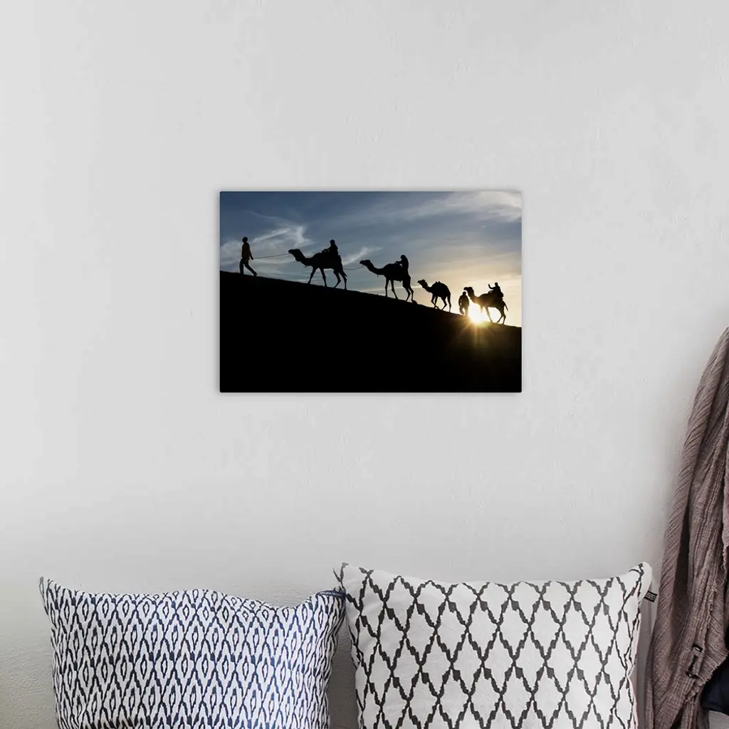Berber Silhouette At The Sunset In The Sand Dunes With Dromedary, Sahara Desert, Tunisia