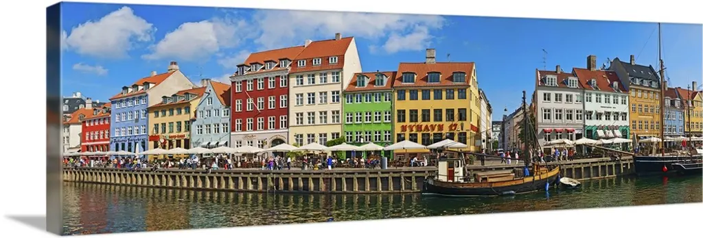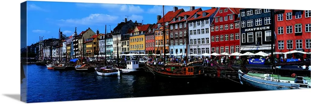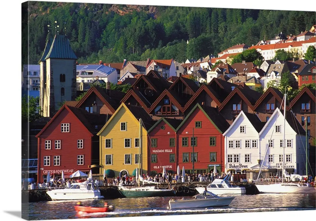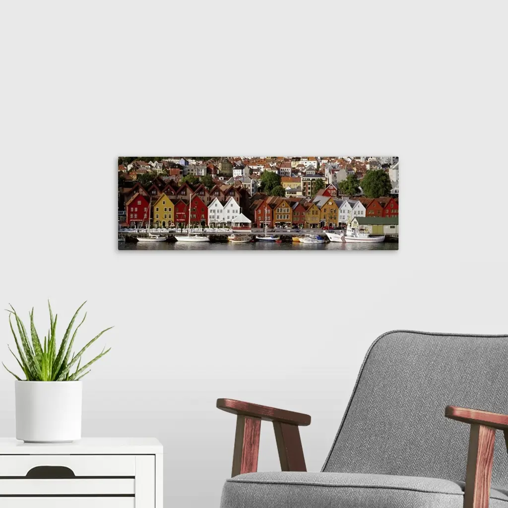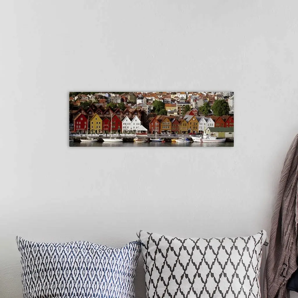 This is a panoramic photograph of a coastal town in Northern Europe lining a harbor full of boats.