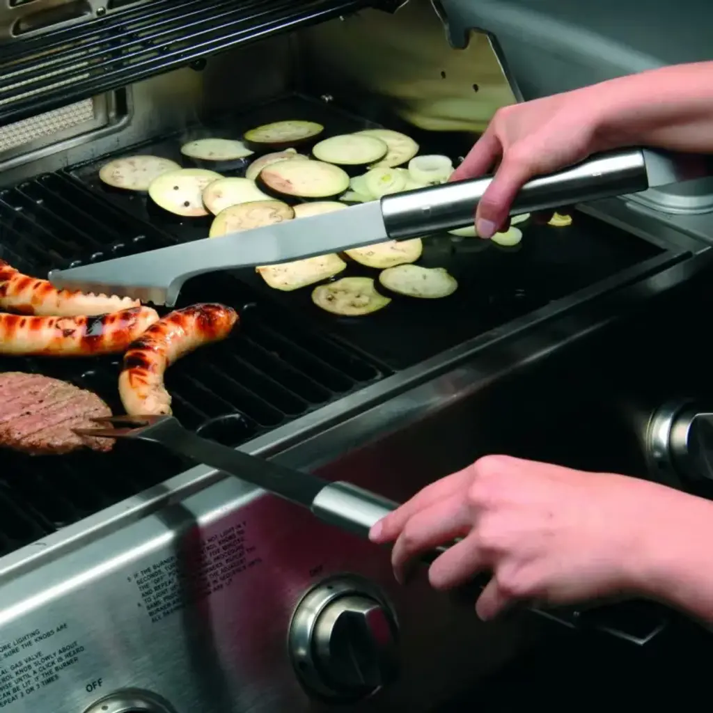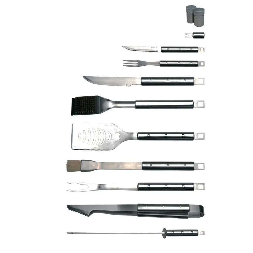 Cubo's 33Pc BBQ Set has everything you need to spend quality time with family and friends while enjoying delicious meals is an important part of your social life. Set includes: (2 1/2") salt cellar, (2 1/2") pepper pot, 6 (2 1/4") corn cob holders, 6 (10") steak knives, 6 (10") steak forks, (16 1/2") barbecue knife, (18") grill scraper, (18") slotted turner, (18 1/2") small brush, (18 1/2") meat fork, (18 1/2") tongs, 6 (18 1/2") skewers, and carrying case. Perfect for hobby and professional cooking!