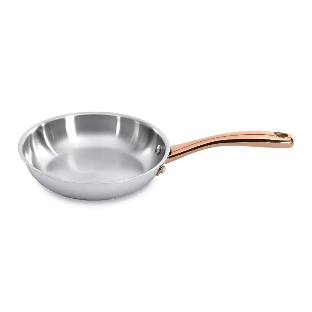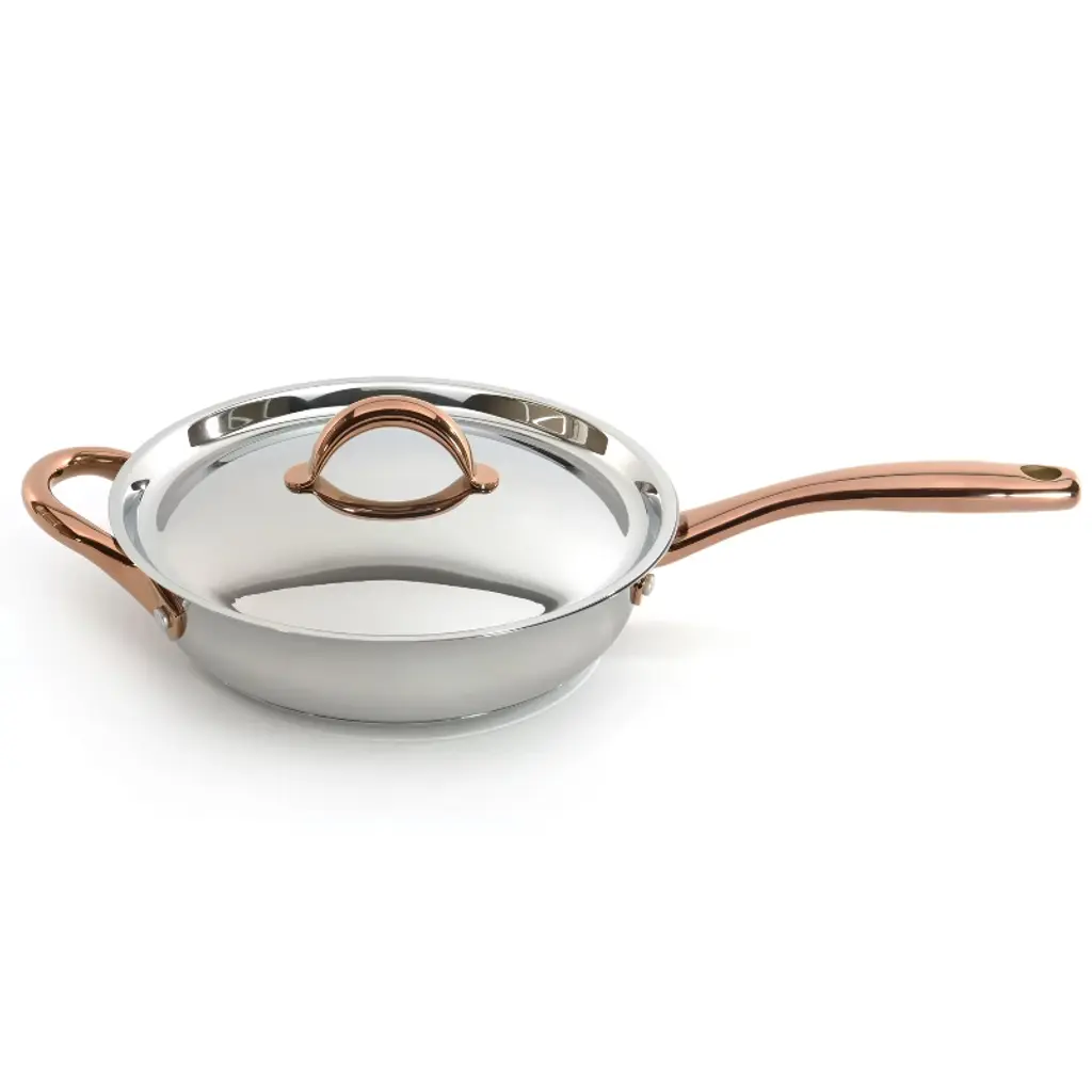 Ouro 17Pc Cookware set is offering a wide range of pots, pans, and utensils to meet all your cooking needs. Crafted with 18/10 stainless steel material with rose gold handles and features 6 bamboo kitchen utensils. Whether you're simmering a delicious sauce in the saucepan, boiling pasta in the stockpot, or frying up a tasty breakfast in the fry pans, this cookware set has got you covered. The set includes a variety of essential pieces, such as a deep skillet for sautéing vegetables or searing meats, a steamer insert for healthy steaming, and a complete bamboo utensil set that is heat-resistant and won't scratch or damage your pots and pans. No need to worry about any unwanted marks or scratches. Stainless steel lids seal the pots tightly, preventing moisture and juices from escaping. This not only helps to retain the flavors and nutrients of your food but also ensures that your dishes cook evenly and efficiently. Built to withstand frequent use and a fast, easy cleanup. Wait until cool, wash with mild soap and warm water. Set includes: 6.25" 2.5qt sauce pan, 8" 5qt stockpot, 10" 8.1qt stockpot, 10" 3.1qt deep skillet with extra handle, 8" fry pan, 10" fry pan, 10" steamer insert, 2 bamboo spatulas, 4 bamboo spoons, 4x matching lids.