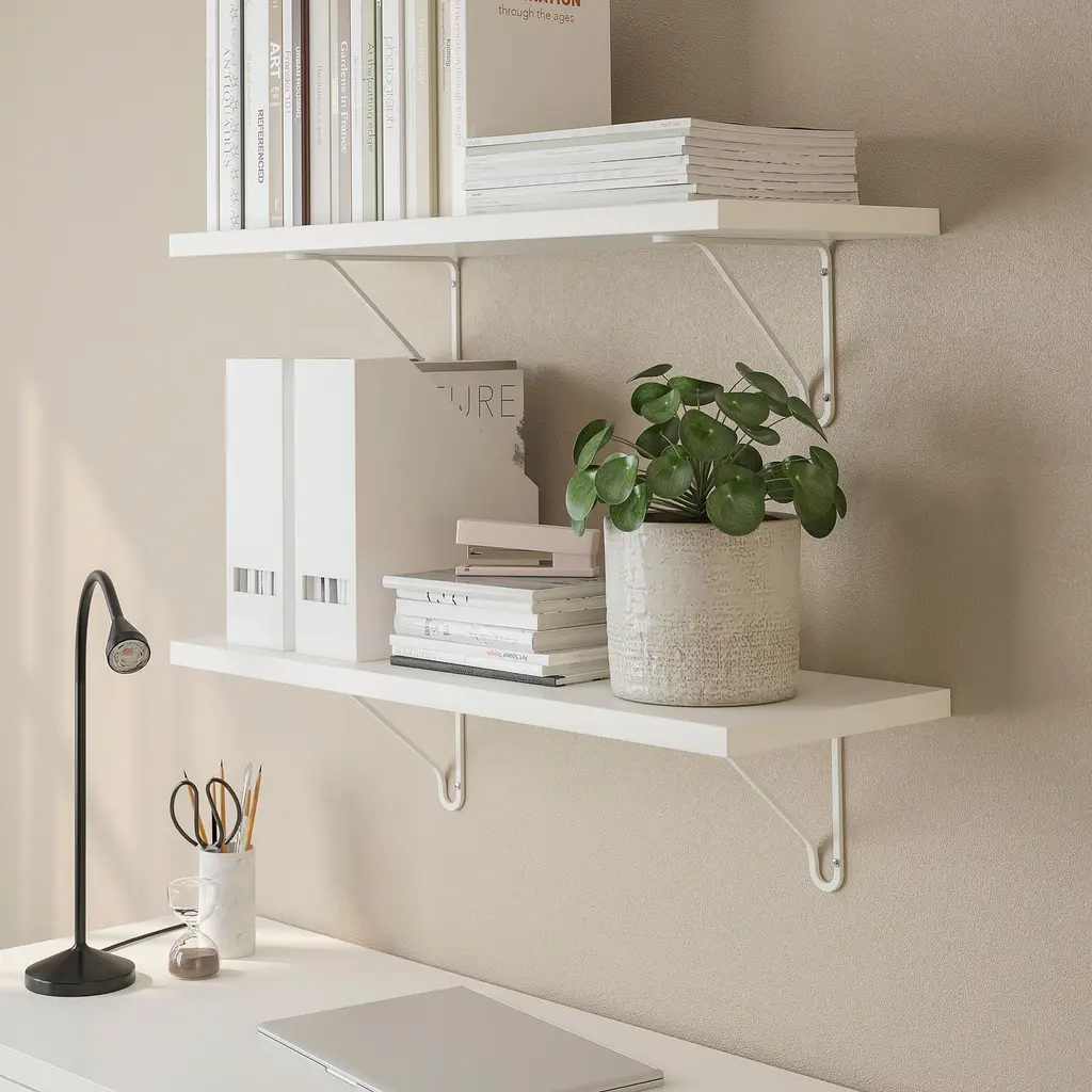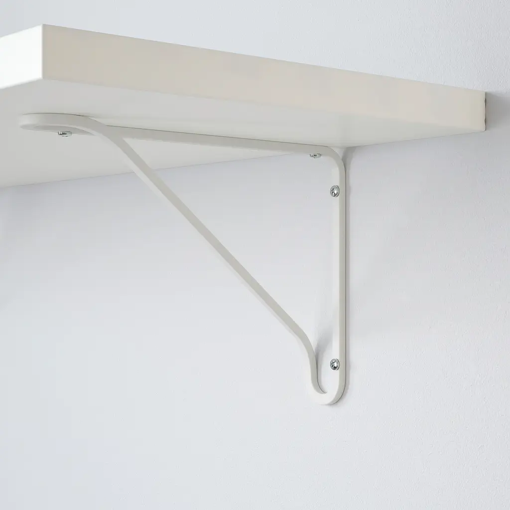 BERGSHULT / FÖRLÄGGARE Wall shelf - white/white 31 1/2x11 3/4 ". With a wall shelf, you make the most of the wall area, while freeing up space on the floor. The shelf carries a max. of 22 lbs when properly mounted on the wall. Screws to mount the bracket to the shelf are included.