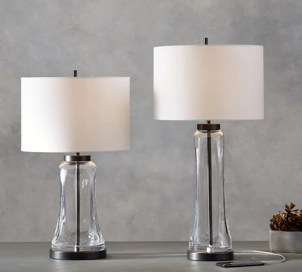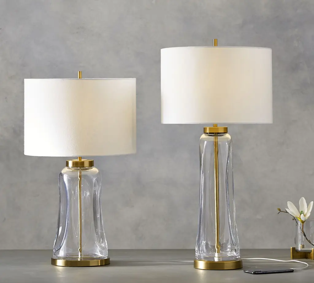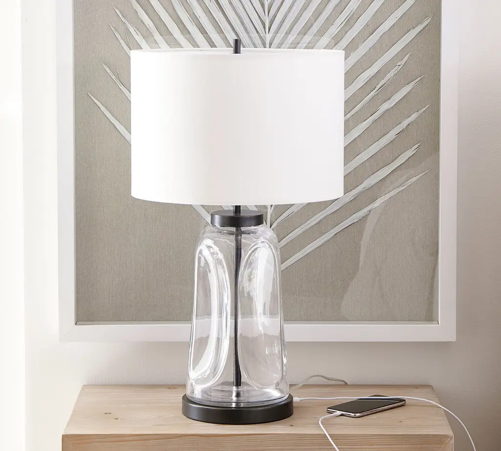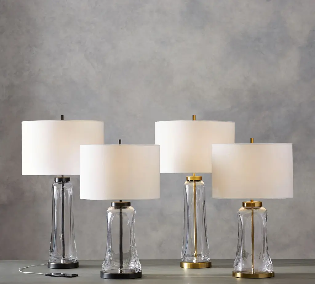 Soulful, sculptural and tailored, the Berkeley Table Lamp was inspired by a European glass vase with dimpled details. Its clear body features soft curves anchored by a metal base and cord-concealing post, plus a USB port for easy desktop or bedside charging.