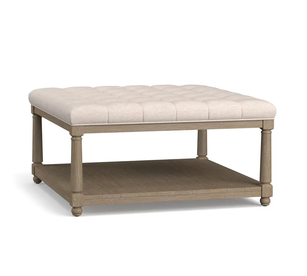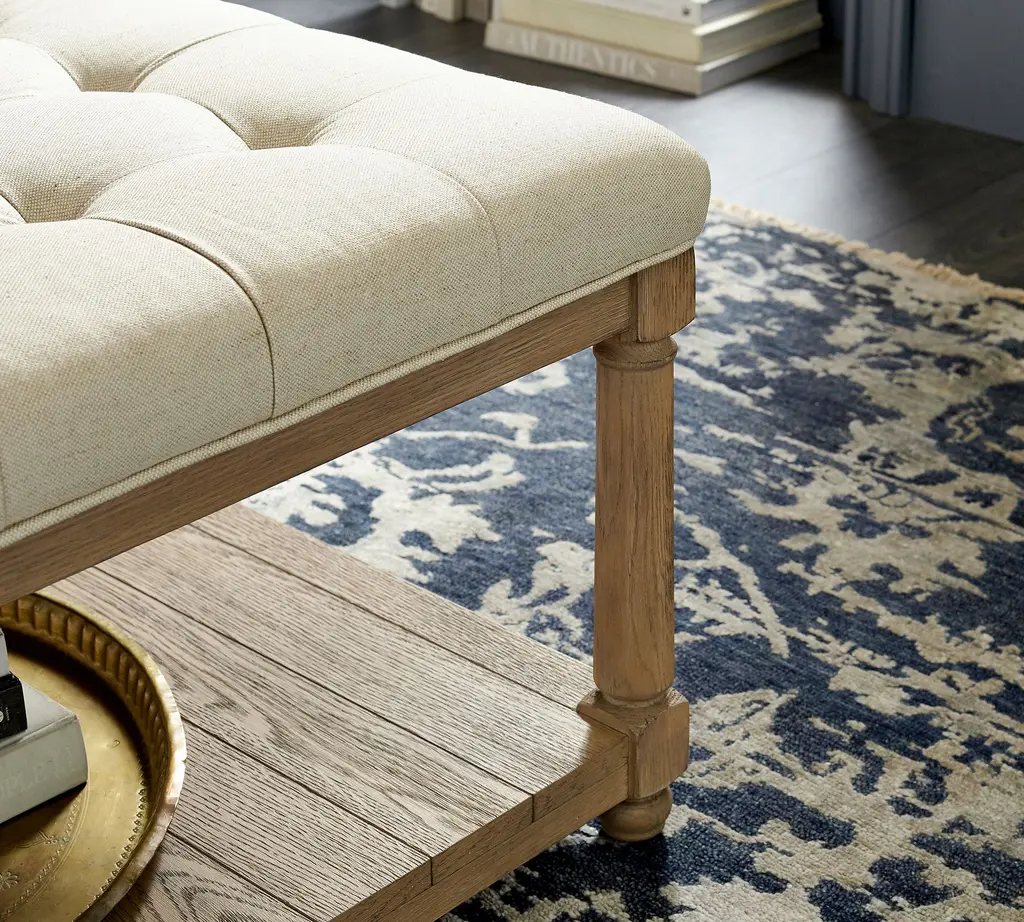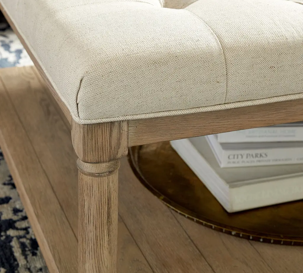 A plush tufted seat tops the classically designed Berlin Ottoman. Four turned-leg columns and a slatted shelf create an open feel, and a light finish on the wood adds an artisanal character. Ideal for gatherings, it can be used as additional seating or as a family-friendly coffee table.