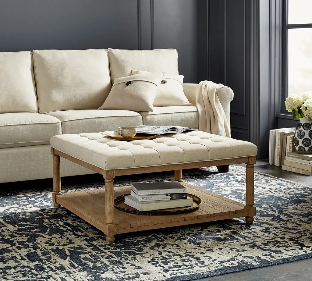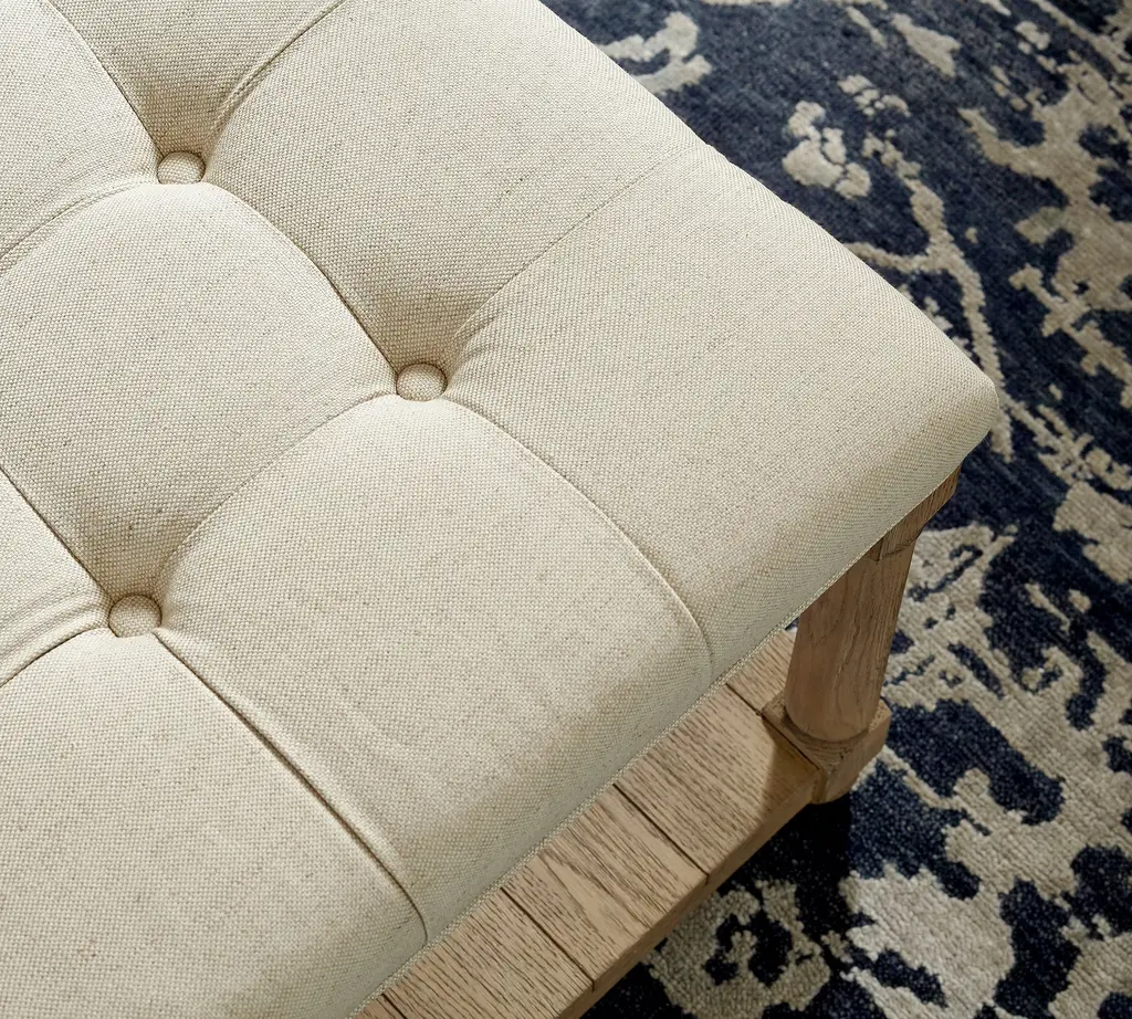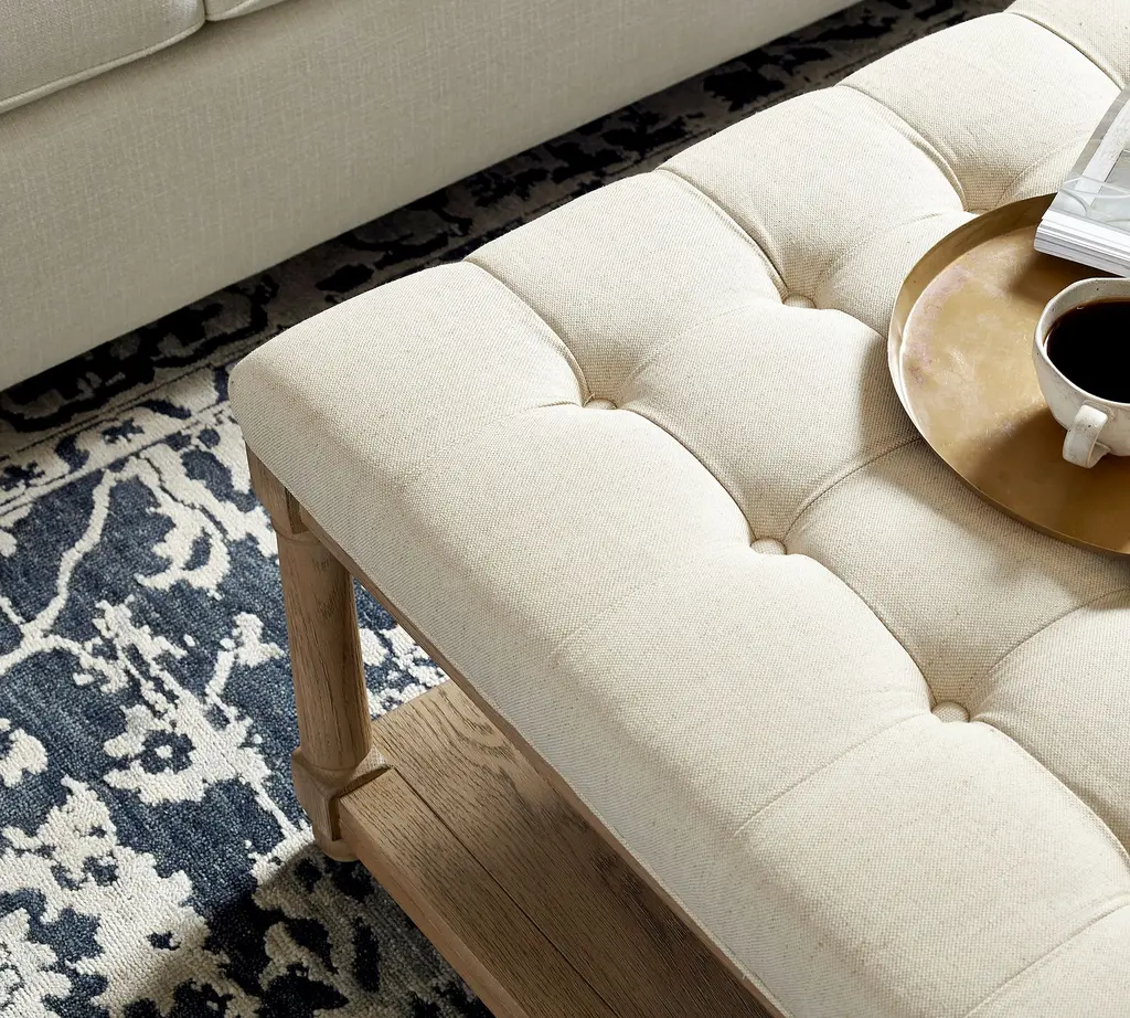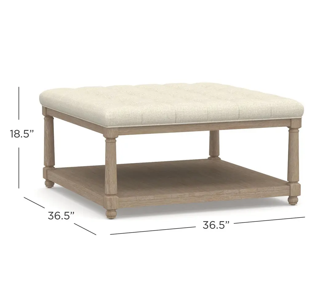 A plush tufted seat tops the classically designed Berlin Ottoman. Four turned-leg columns and a slatted shelf create an open feel, and a light finish on the wood adds an artisanal character. Ideal for gatherings, it can be used as additional seating or as a family-friendly coffee table.