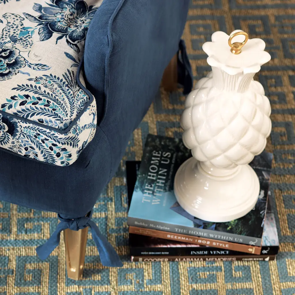The pineapple is the welcoming sign of hospitality. The Bermuda objet is made with cream crackled porcelain with a solid brass ring finial. Design suggestion: Decorate in pairs on the mantle or on each side of a doorway to welcome your guest. Material: Porcelain, Brass Dimensions: 7" W x 17" H x 7" D Weight: 9 lbs. Ships Via: UPS Free shipping in the U.S.