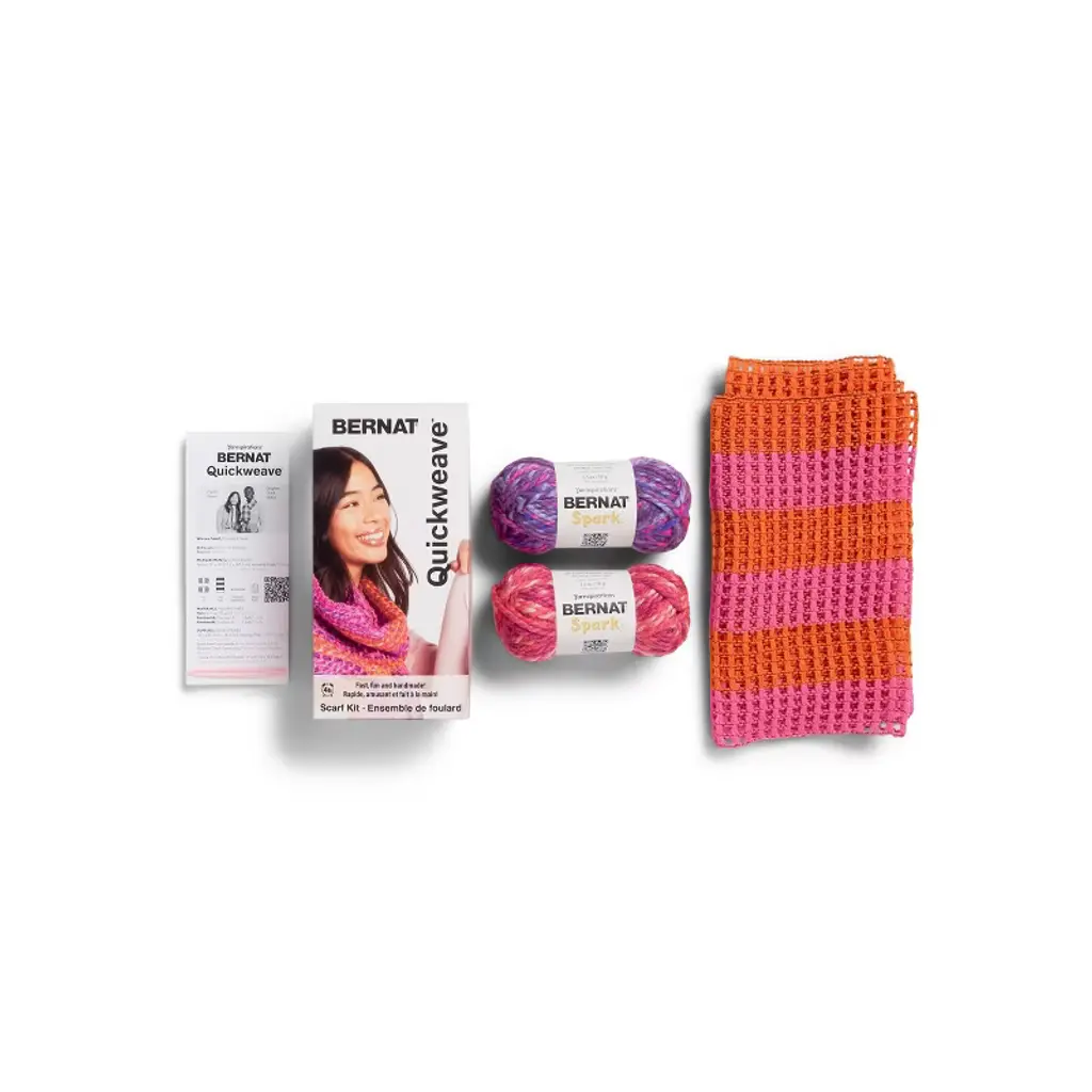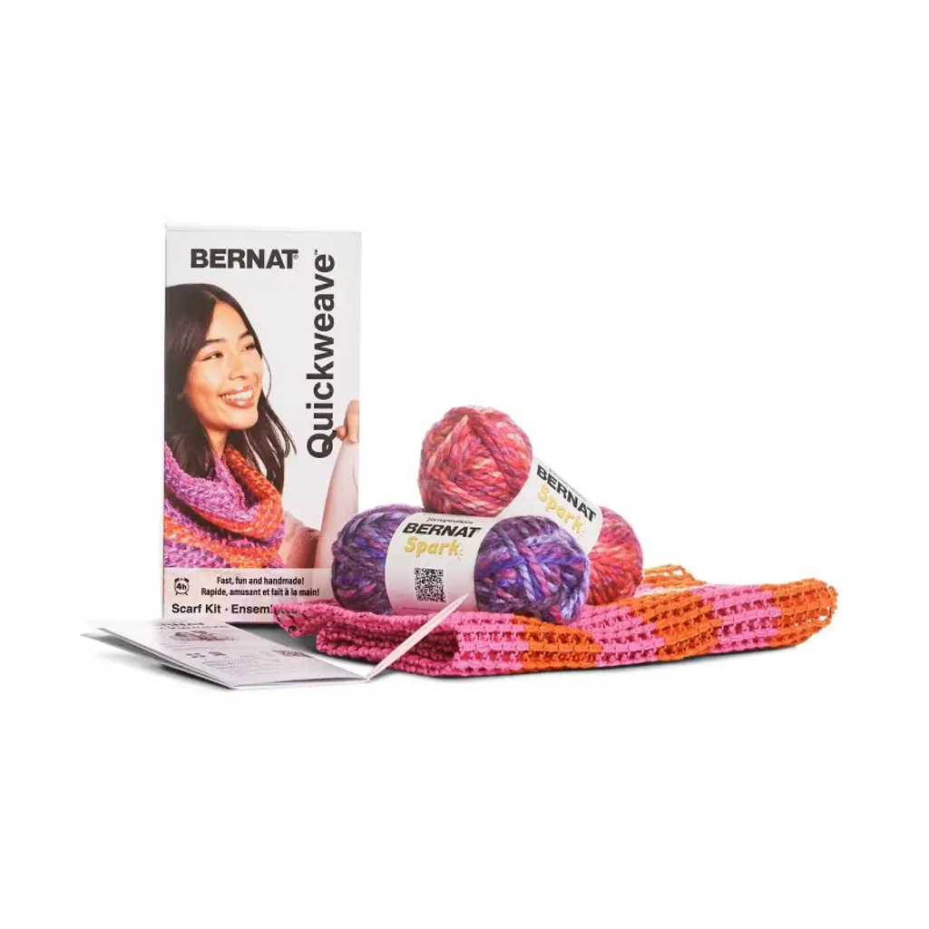 Introducing the Bernat Quickweave Scarf Weaving Kit, designed to bring the art of weaving within everyone's reach. Whether you're a seasoned crafter or a complete beginner, this kit offers an immersive and fulfilling experience. In just under 4 hours, you'll transform a selection of premium yarns into a stunning scarf that's as unique as you are! Crafted with simplicity in mind, our kit includes everything you need to make your own beautiful scarf: a simple grid, an assortment of vibrant yarns, a weaving needle, and step-by-step instructions. No prior weaving experience is required – our easy-to-follow guide will walk you through each stage of the process, from starting your project to adding the finishing touches.Beyond the satisfaction of creating something beautiful with your own hands, weaving offers a therapeutic escape from the stresses of daily life. Immerse yourself in the rhythmic motion of the loom, and watch as your creation takes shape before your eyes.