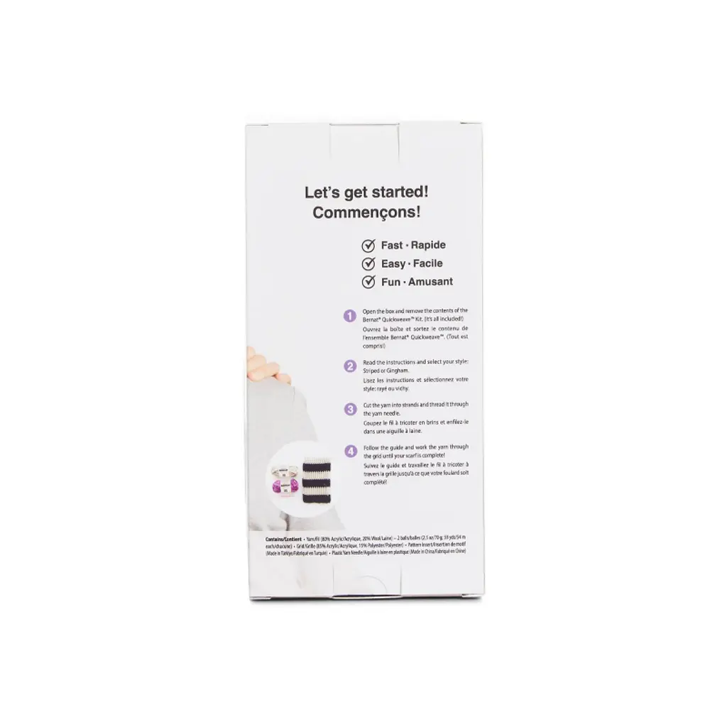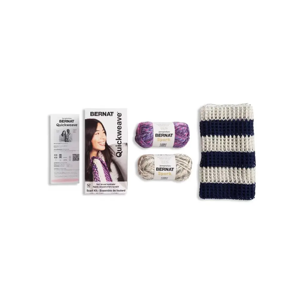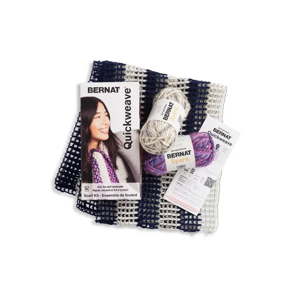 Introducing the Bernat Quickweave Scarf Weaving Kit, designed to bring the art of weaving within everyone's reach. Whether you're a seasoned crafter or a complete beginner, this kit offers an immersive and fulfilling experience. In just under 4 hours, you'll transform a selection of premium yarns into a stunning scarf that's as unique as you are! Crafted with simplicity in mind, our kit includes everything you need to make your own beautiful scarf: a simple grid, an assortment of vibrant yarns, a weaving needle, and step-by-step instructions. No prior weaving experience is required – our easy-to-follow guide will walk you through each stage of the process, from starting your project to adding the finishing touches.Beyond the satisfaction of creating something beautiful with your own hands, weaving offers a therapeutic escape from the stresses of daily life. Immerse yourself in the rhythmic motion of the loom, and watch as your creation takes shape before your eyes.
