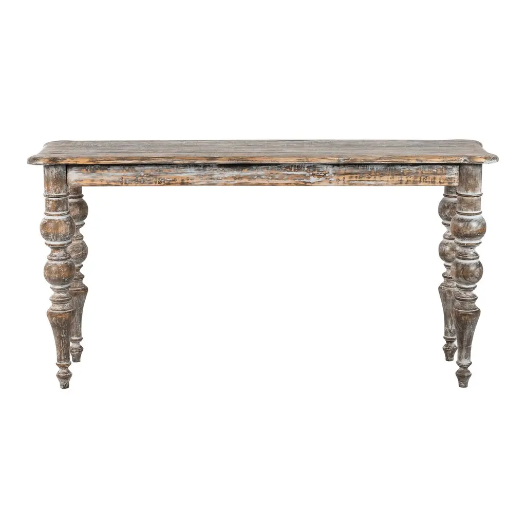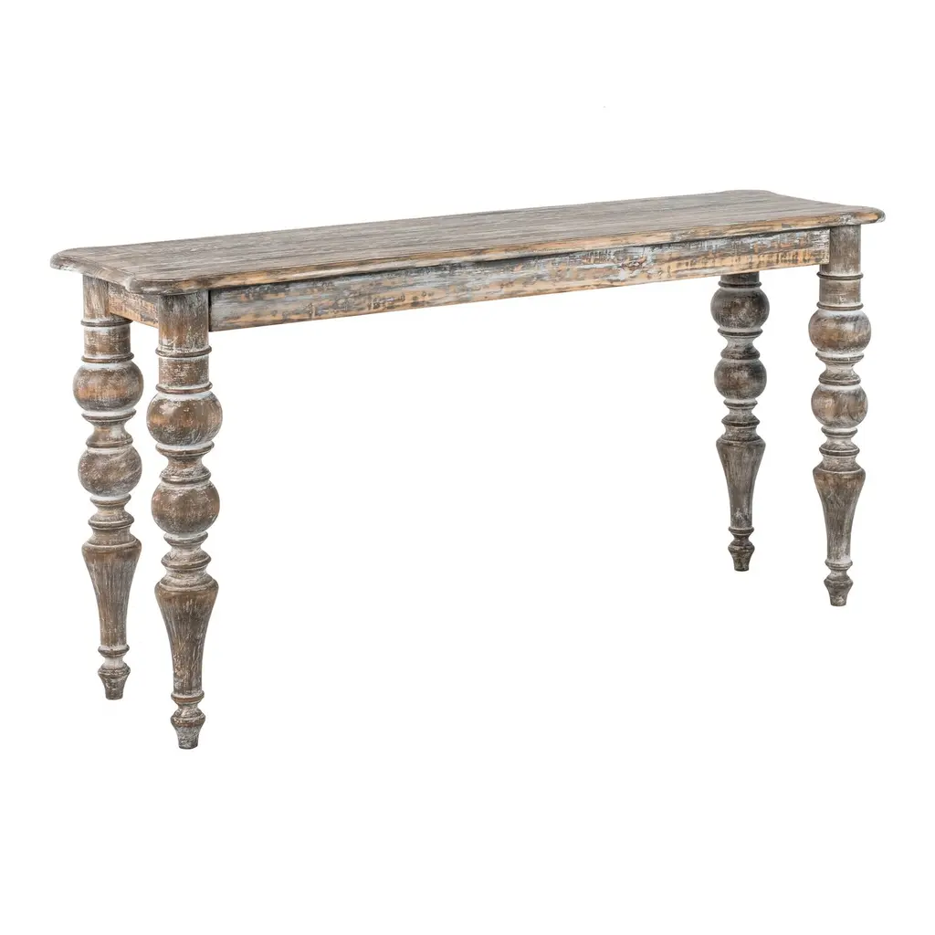 The Berne console table delivers a wealth of French farmhouse-inspired charm with its scalloped tabletop and shapely spooled legs. This entryway table is made of hand-painted pine wood with sage and black undertones to add antique texture and dimension to the finish. A one-of-a-kind work of natural art with unique variations in color and grain pattern, its reclaimed-wood construction guarantees that no two pieces are alike.