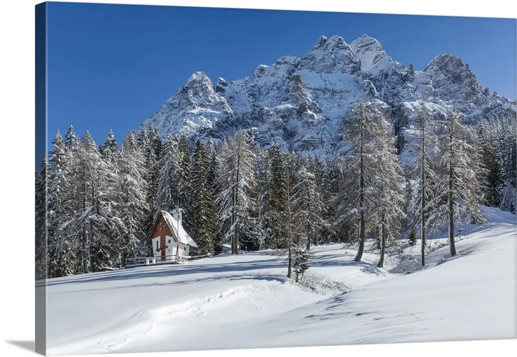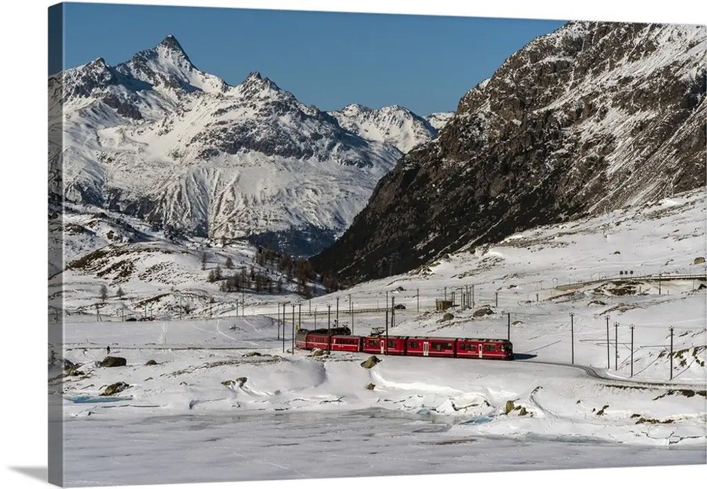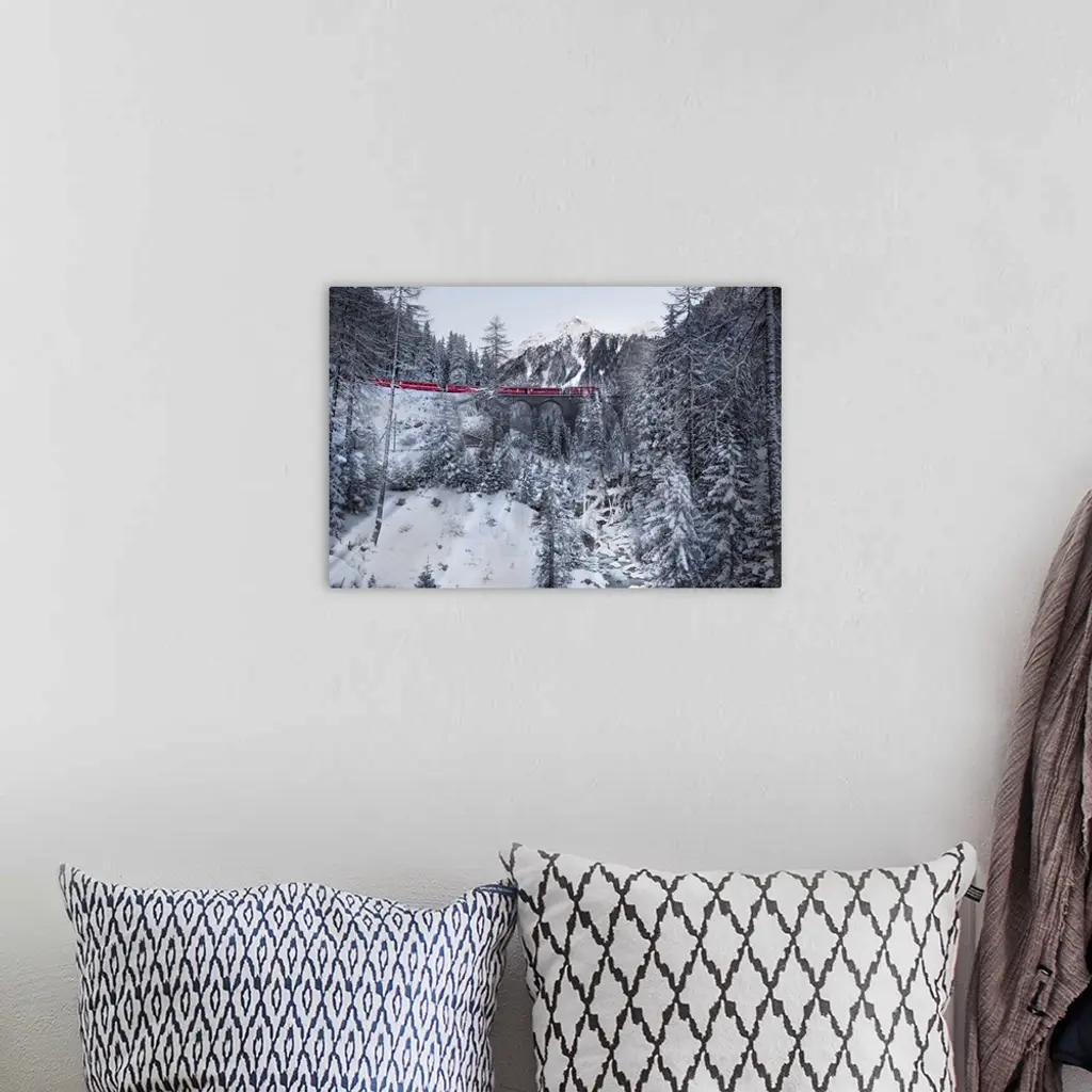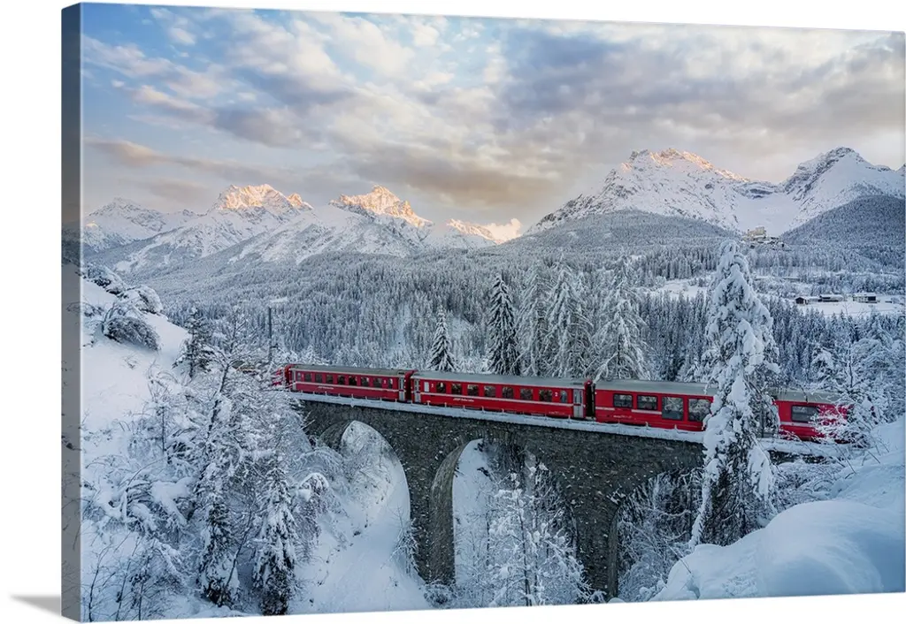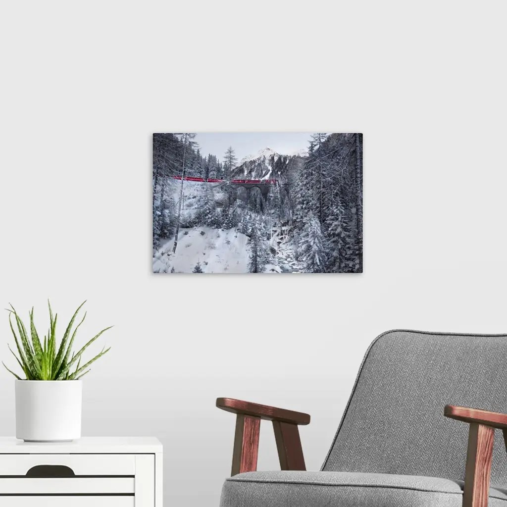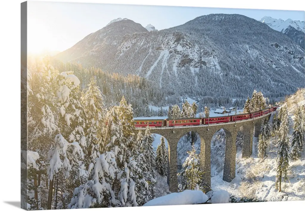 Photograph of a red train passing through a snowy mountainous valley in winter along an arched railroad.