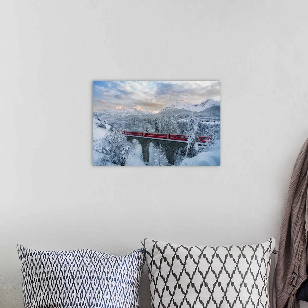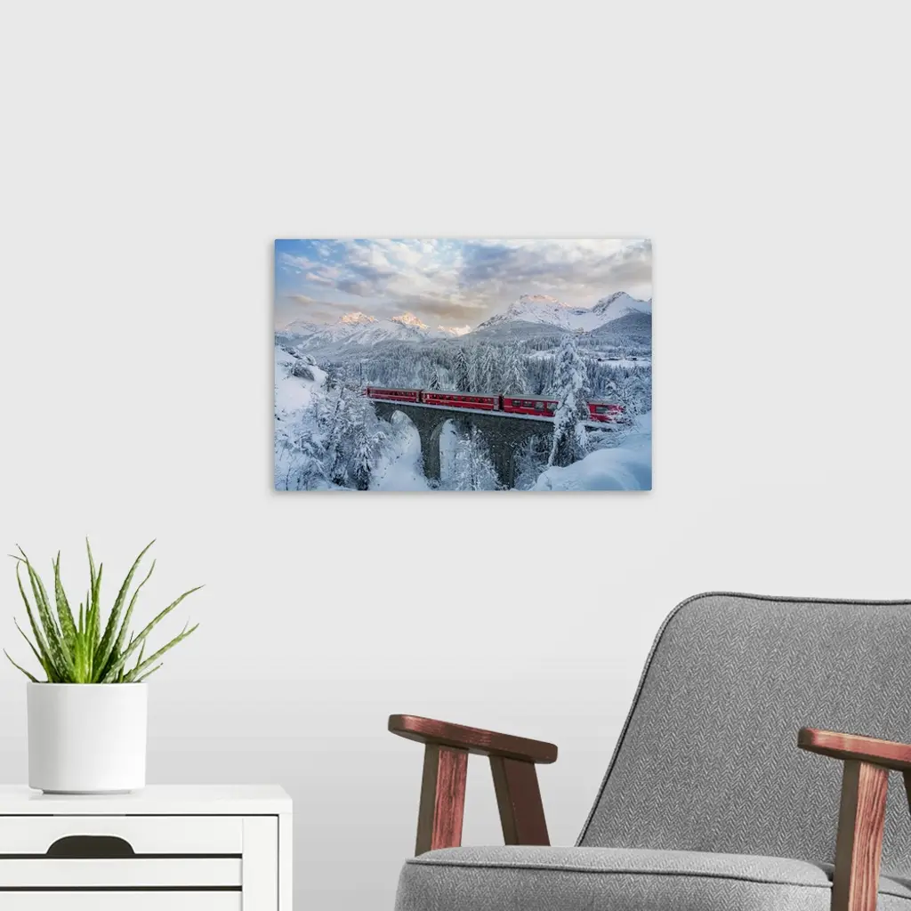 Bernina Express Passes On A Viaduct Near Tarasp, Graubunden, Engadine, Switzerland