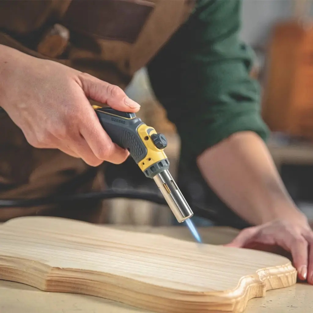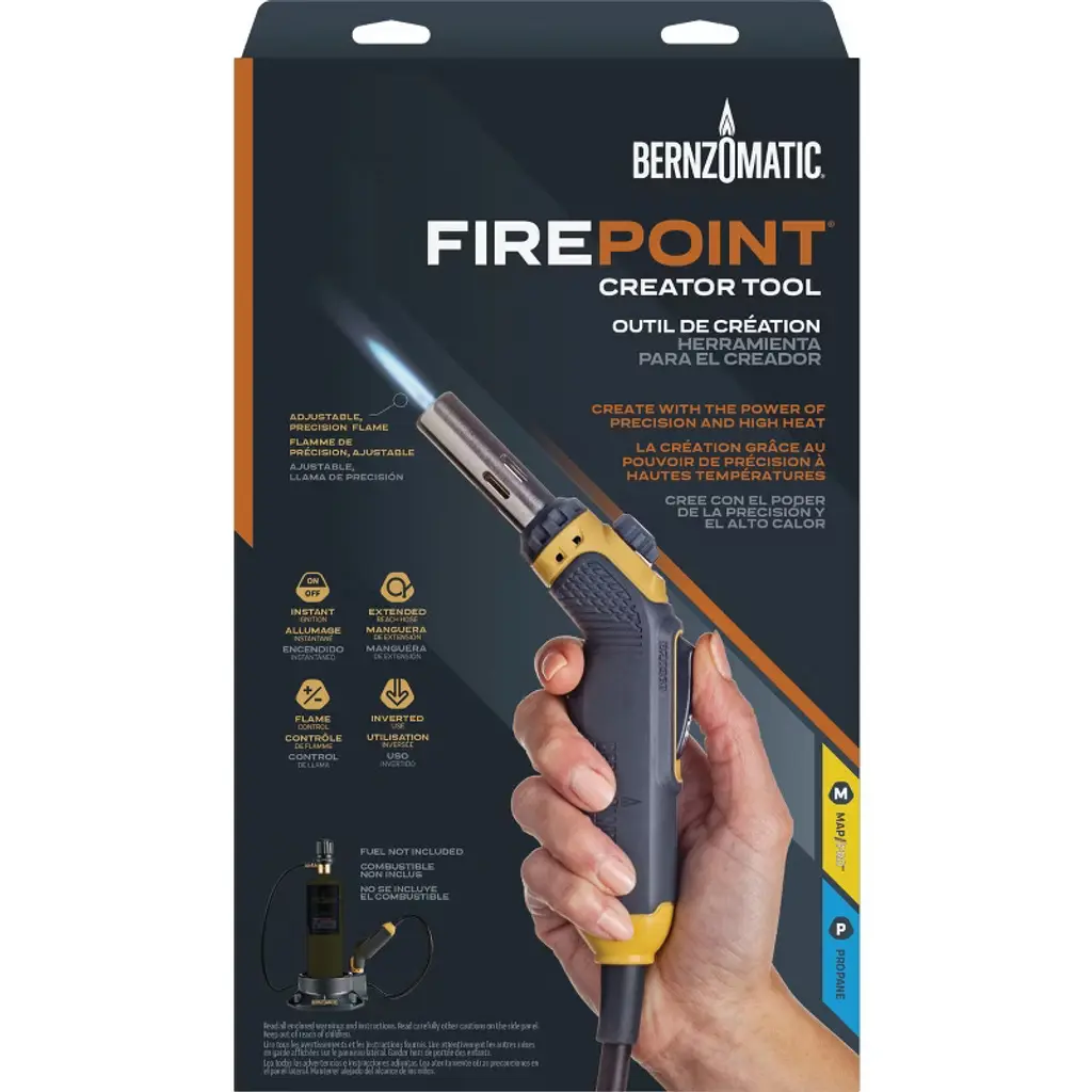 The Bernzomatic FirePoint Creator Tool pairs the power of precision with the intensity of Bernzomatic MAP-PRO heat to help you achieve truly unique creations. Experience full control for your detailed woodworking, metalworking, jewelry, art and home decor projects with this compact tool featuring an adjustable, precision flame and a slip-resistant, versatile grip handle. It is designed for single-handed use with auto on/off ignition and continuous flame lock option. The portable, lightweight fuel stand provides stability for a 14 oz or 16 oz fuel cylinder while you work and includes a heat-resistant torch dock to safely and conveniently store the hot tool after switching off the flame. The FirePoint Creator Tool is compatible with Bernzomatic MAP-PRO and Propane fuel. Limited 3-Year Warranty.