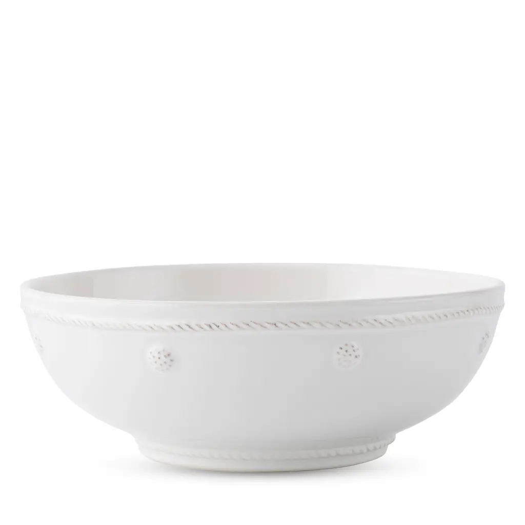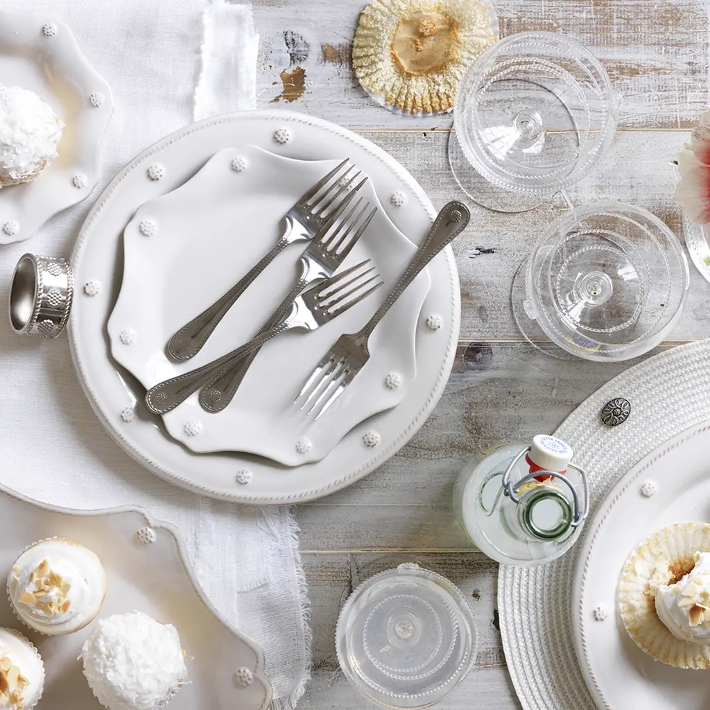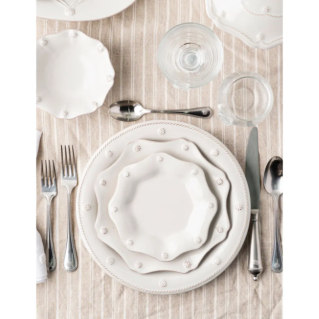 Rimmed with a simple thread and adorned with a sprinkling of berries, Juliska's new 4-piece place setting contains a round dinner plate, scalloped dessert/salad plate, cereal/ice cream bowl and 7.75" coupe pasta bowl. Portuguese stoneware ceramics echo the same artisanal production as Juliska glassware. They have developed a variety of exquisite transparent, opaque, and metallic glazes on a tough Portuguese stoneware body. All are lead free and each has the same tough durability to handle the most demanding everyday use.