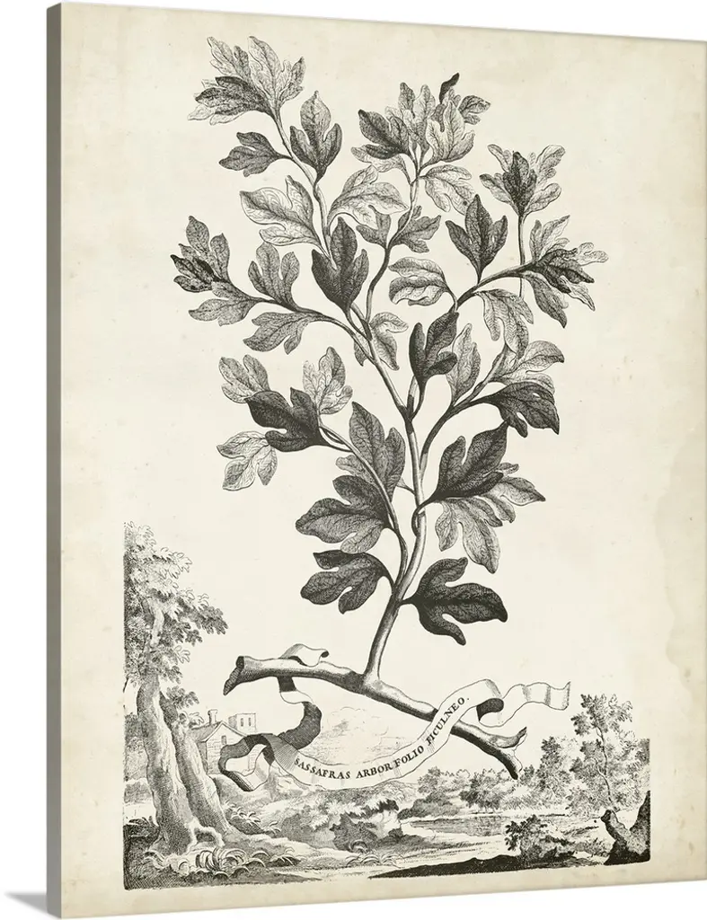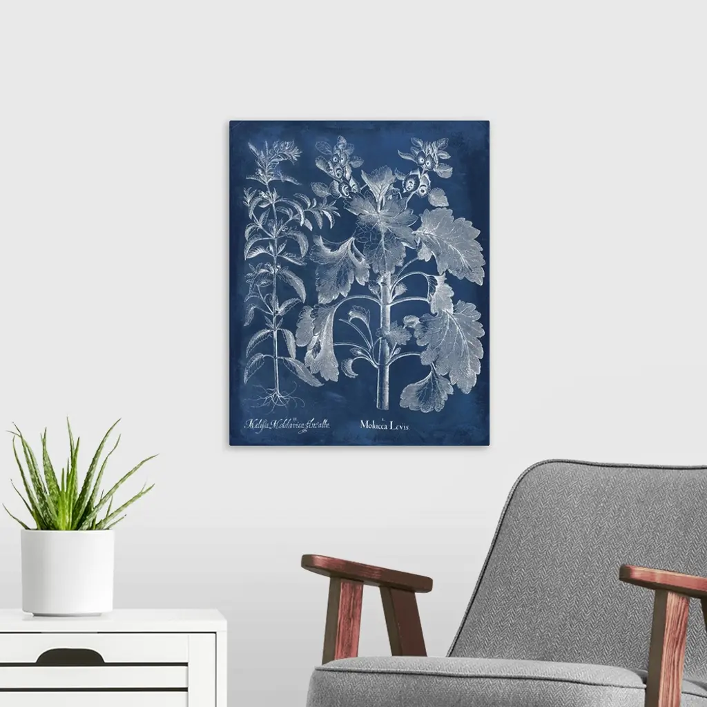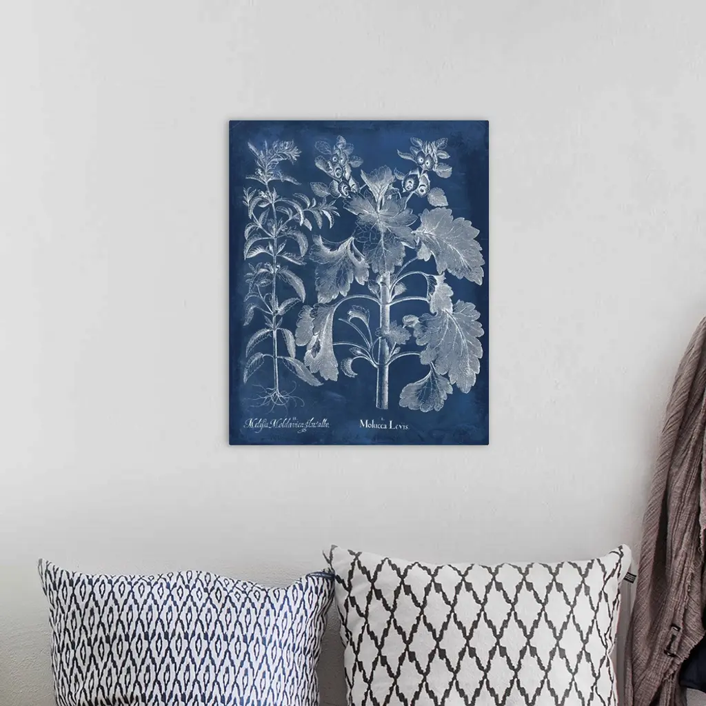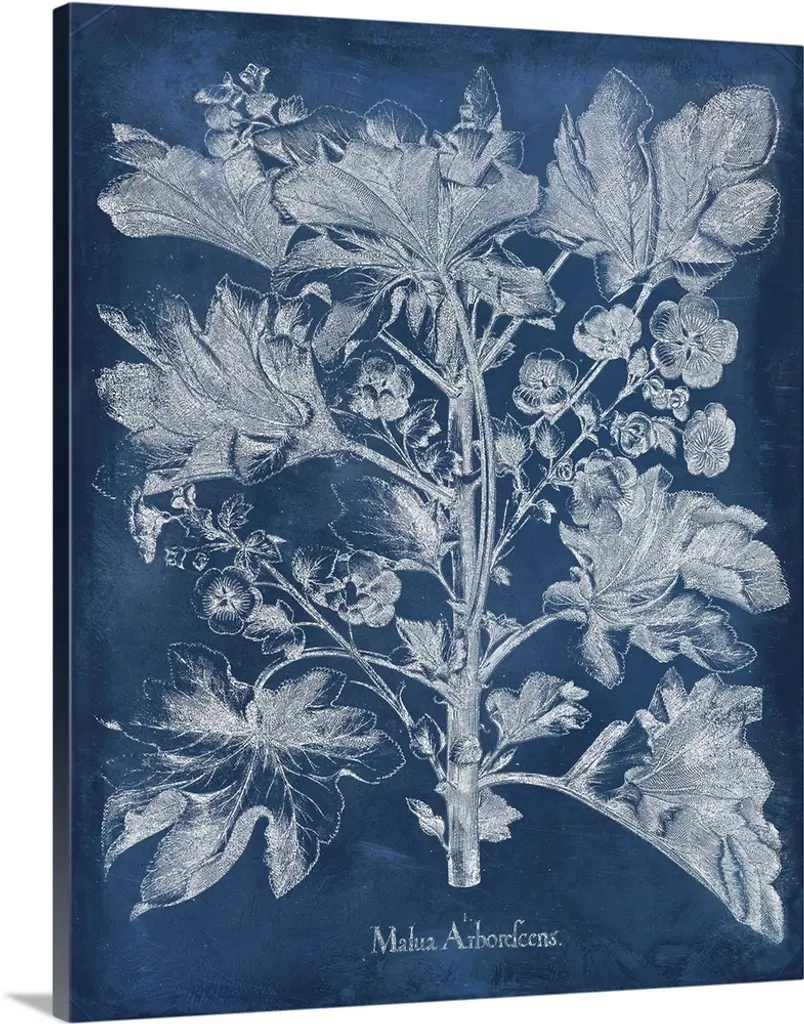 Vintage-inspired botanical illustration of besler leaves on an indigo background.