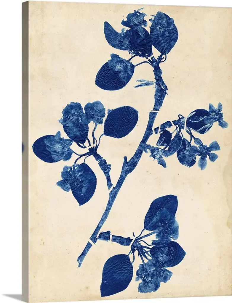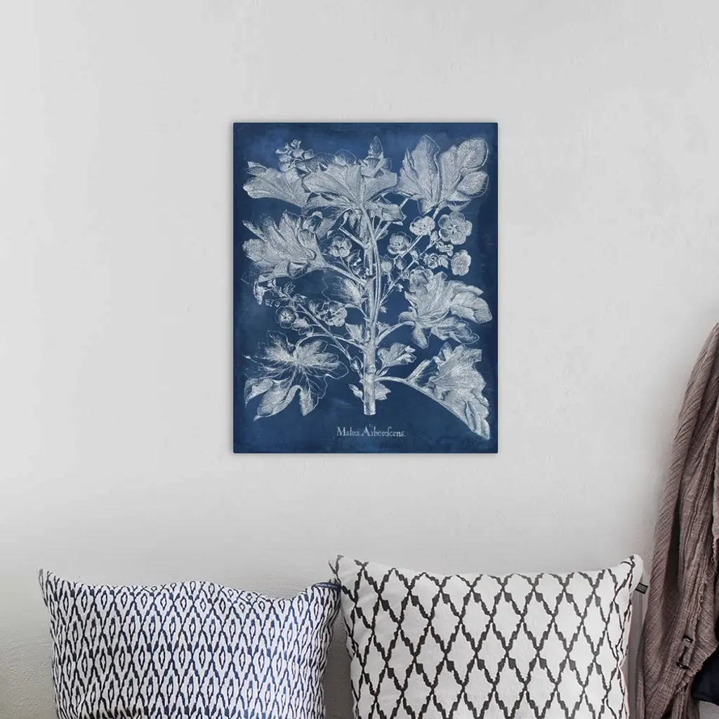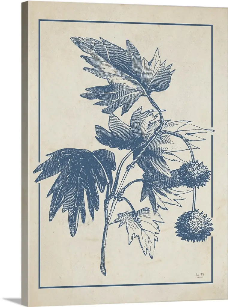 Vintage-inspired botanical illustration of besler leaves on an indigo background.