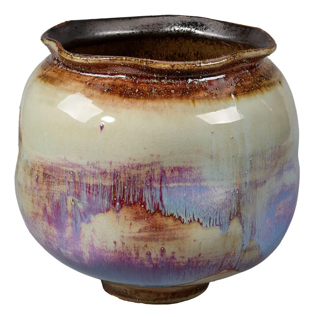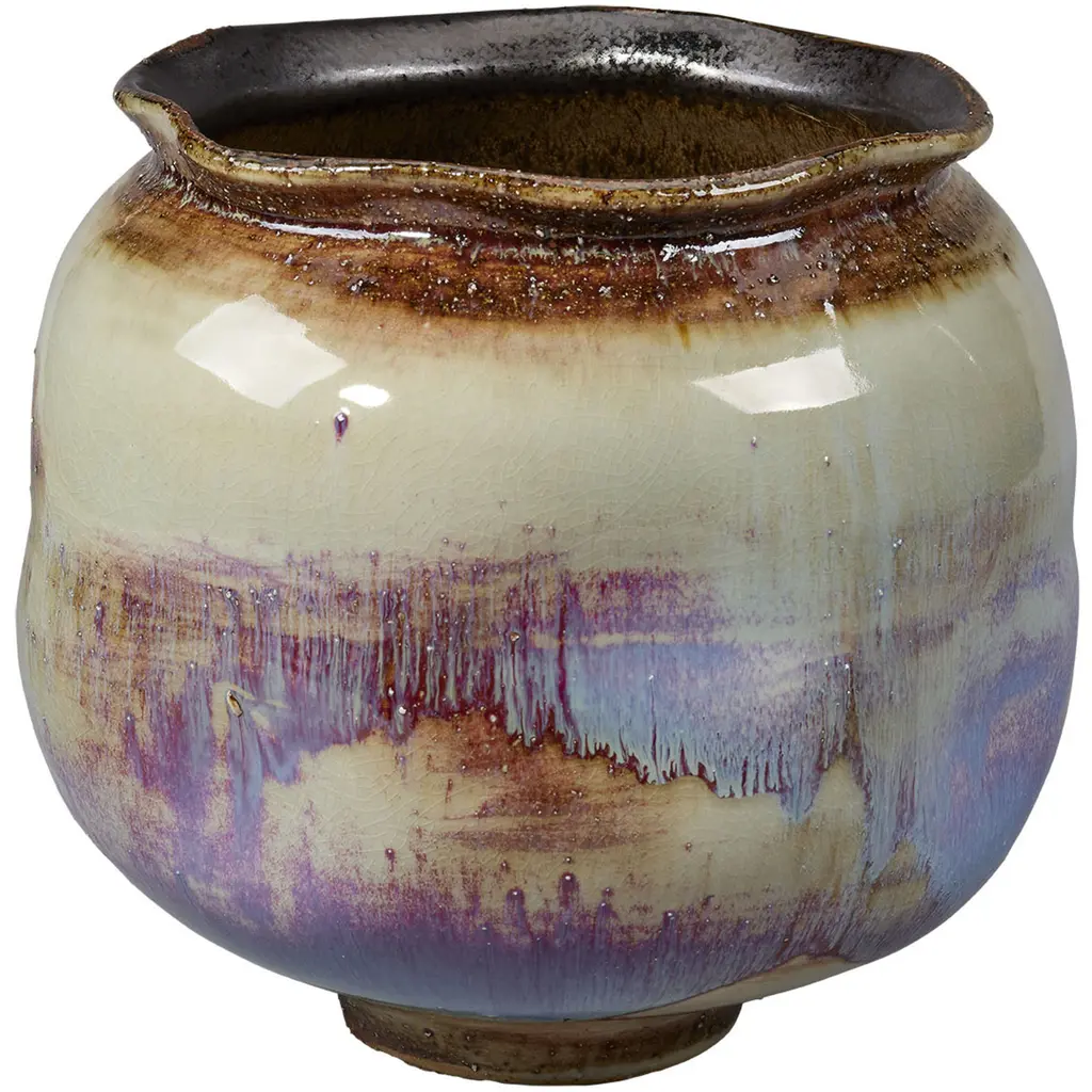 When heavy-hitting texture is desired, the Bessbrook Small Cachepot brings it in spades. Made of ceramic with swirling and dripping patterns in blue reactive glazes, the drifts of color will be slightly different from vessel to vessel. This artisanal piece was made by women artisans living at the border of Burma and Thailand. The blue planter will be a plant's biggest complement.