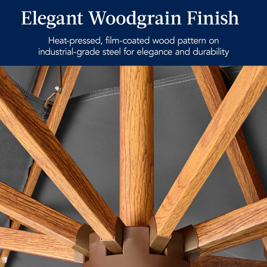 Enhance your outdoor experience with this stylish offset umbrella, designed for both comfort and convenience. The distinct woodgrain finish on durable steel provides a warm, natural aesthetic while ensuring exceptional strength and longevity. Easy to set up with an included fillable base, you can secure it with sand or water for stability against the wind, allowing you to enjoy instant shade in your backyard or patio. As the sun sets, the built-in solar-powered LED lights create a cozy and inviting atmosphere, perfect for evening gatherings. With a spacious canopy that offers generous protection from harmful UV rays and a clever vent for improved airflow, you can stay cool and comfortable even on the hottest days. Plus, the innovative foot pedal allows you to effortlessly rotate the umbrella 360°, providing customizable shade wherever you need it.