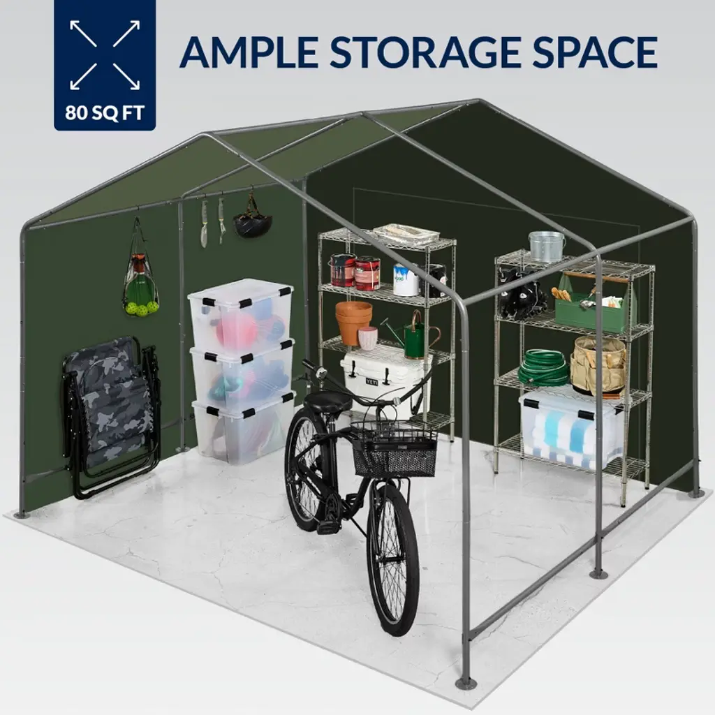 Imagine adding a rustic yet efficient touch to your property with this spacious canopy, offering a generous 80 square feet of versatile storage for everything from bikes to lawnmowers. Its dual roll-up doors allow easy access from both the front and rear, making it a perfect mini carport or bike shed while promoting airflow to keep your items fresh. Assembly is a breeze, thanks to a durable steel frame and clever design using bungees and stakes that ensure everything stays secure against the elements. Enhanced ventilation comes from thoughtfully placed side windows, complete with roll-up touch fasteners and protective mesh, while the 160G PE-coated fabric promises weather resistance and UV protection to shield your belongings year-round. This addition to your home isn't just practical; it's a laid-back solution that embraces both convenience and the charm of rustic living.