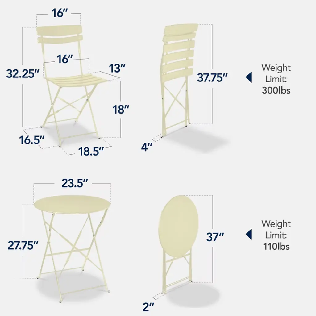 Imagine a charming bistro set that effortlessly brings a relaxed bohemian vibe to your home. Its compact profile makes it perfect for a cozy kitchen nook or as a stylish focal point on your patio or balcony. The convenient folding design allows for easy storage when not in use, and it comes fully assembled for immediate enjoyment. With vibrant colors to choose from, this set adds a splash of joy to your decor, seamlessly matching your personal style. Comfortably seating two, it's the ideal spot for intimate dinners or leisurely chats. Crafted with a solid steel frame, it's built to last, ensuring you can embrace carefree outdoor living with ease.