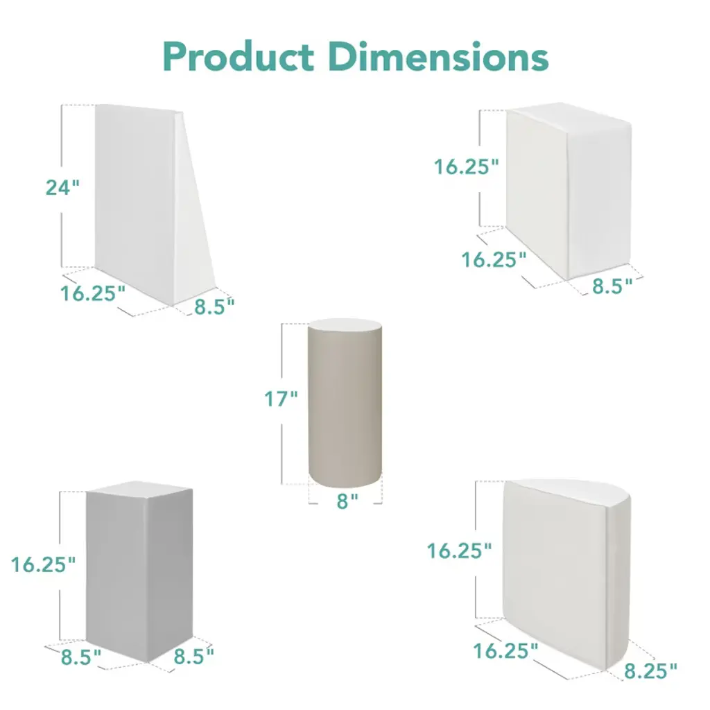 Stimulate and improve your child's development, motor skills and coordination with a foam padding that provides a light, durable surface for your child to play, build, and climb. Comes with 5 fun and colorful shapes; a 20.3cm (Dia) X 43.2cm (H) cylinder, 41.3cm (L) X 21.6cm (W) X 41.3cm (H) large rectangle,41.3cm (L) 21.6cm (W) X 41.3cm (H) half-moon, 21.6cm (L) X 21.6cm (W) X 41.3cm (H) small rectangle, and 4.3cm (L) X 21.6cm (W) X 61cm (H) triangle. As your child plays, they'll develop their hand-eye coordination, gross motor skills, color recognition, and general coordination. This low-maintenance, stain-resistant vinyl covering provides an easy cleaning surface that is both lightweight and durable. This foam block set is made with safe materials that meet U.S. Federal Safety standards and is ASTM F963-17 and CPSIA certified making this a safe and fun option for playtime!