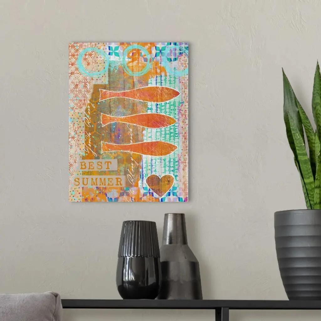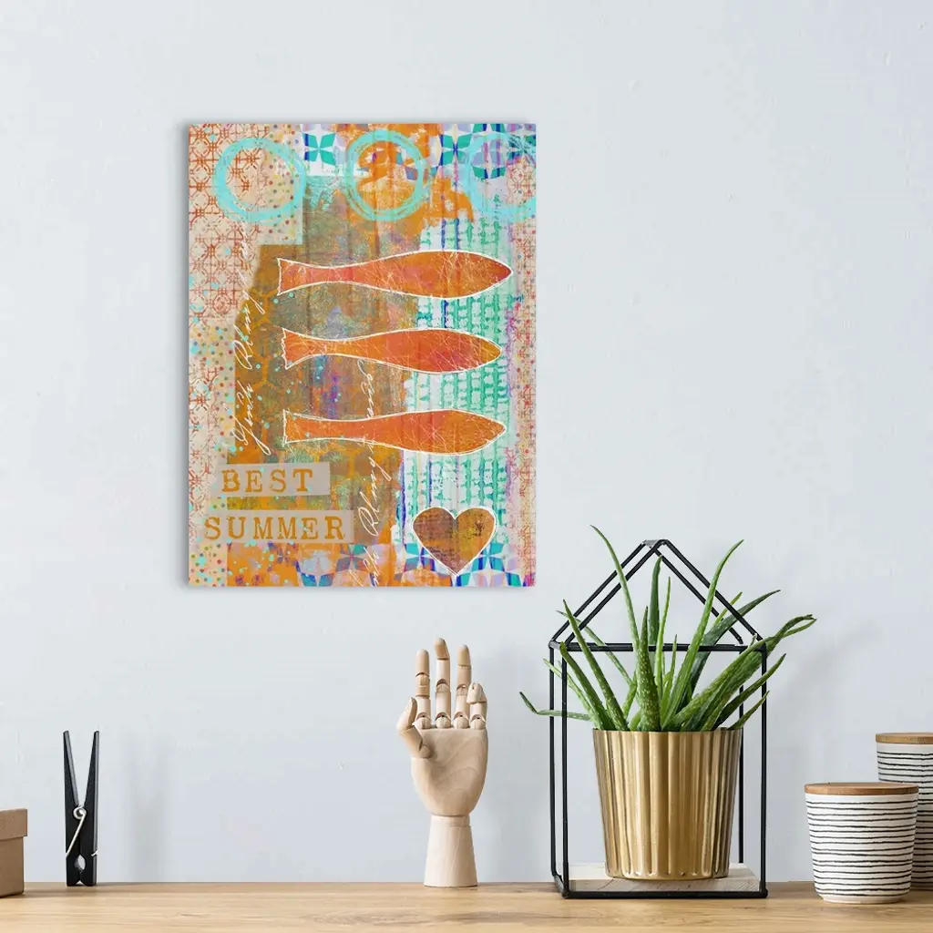Colorful mixed media art with fish and a detailed background.