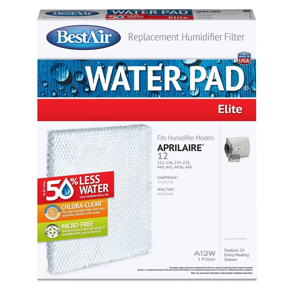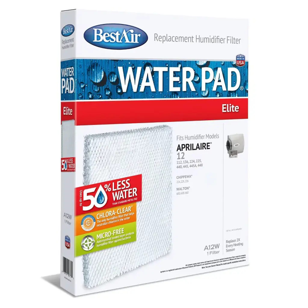 BestAir® is dedicated to providing a clean and comfortable indoor environment for everyone. We have a complete array of high quality humidification wicks, air cleaning filters, water pads and many other accessories, which will ensure that your indoor air quality will be the BestAir® that you and your family can breathe.Our Chlora-Clear® Plus C technology infuses a dechlorination agent treated with Vitamin C deep within our filter's wicking system to help neutralize chlorine. This is important because 90% of public water is treated with chlorine.Waterpad that fits: Aprilaire 112, 136, 224, 440, 445, 445A, 448 (12); Chippewa 224, 225, 226; Humid-Aire Neptune; Walton 600, 620, 660